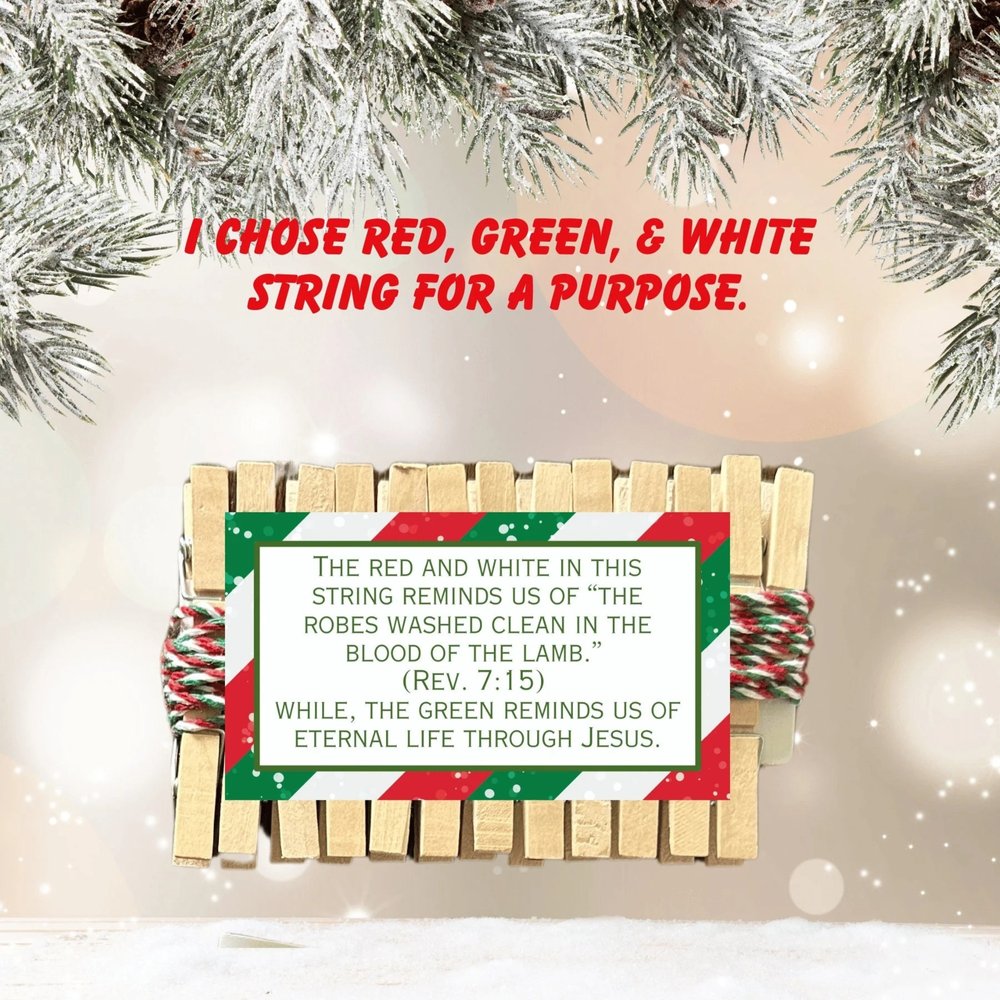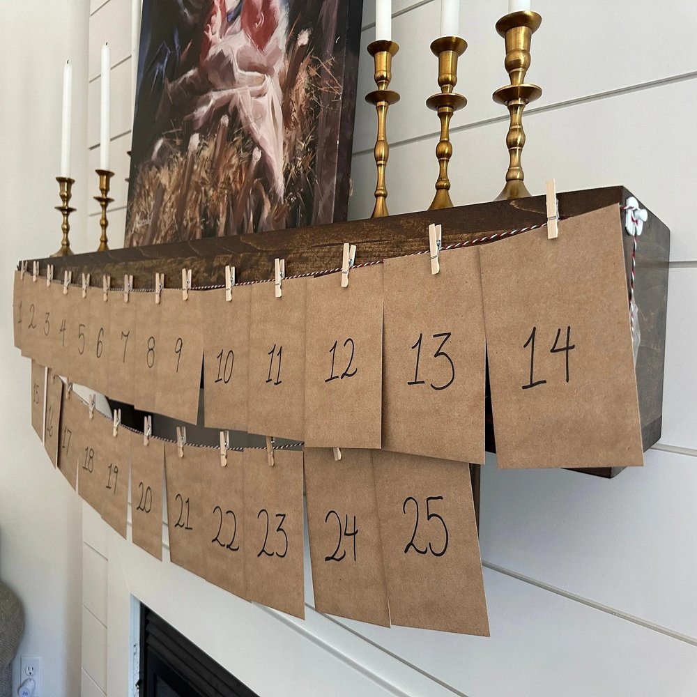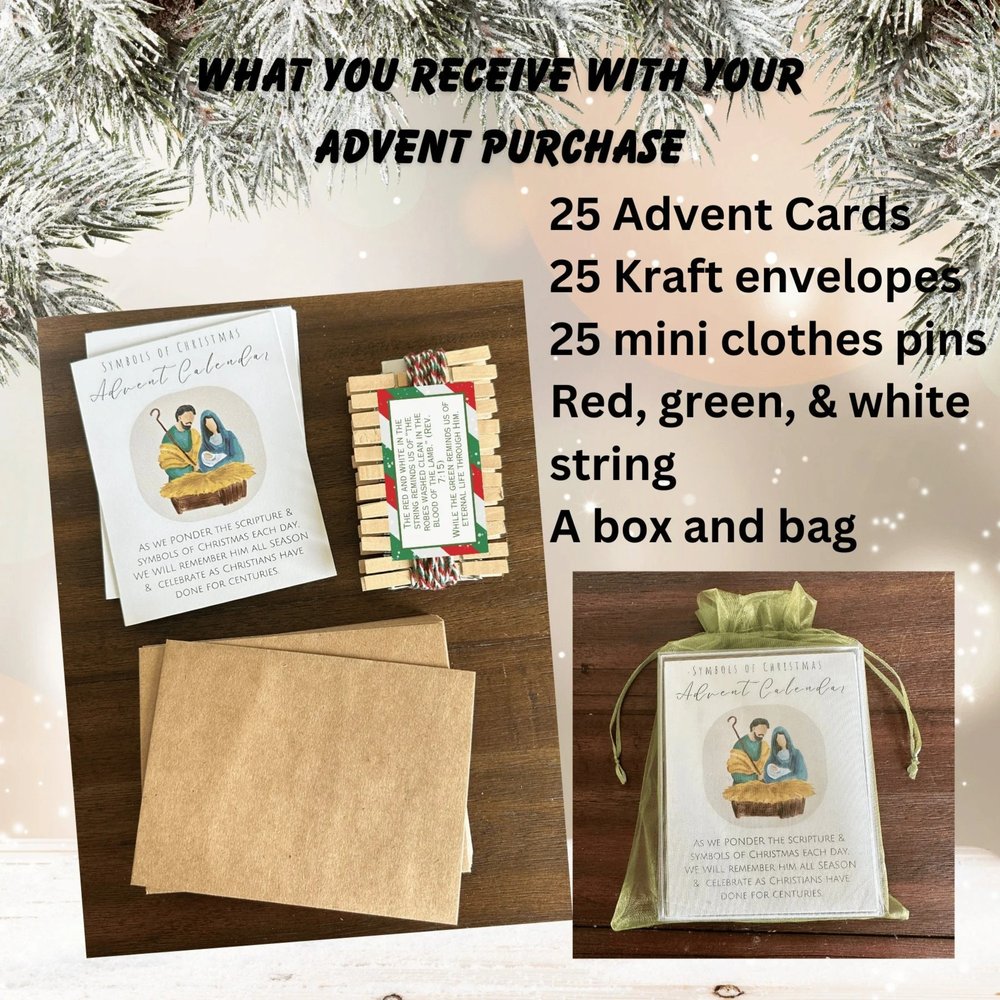 This is a physical item! Your purchase comes with -25 Advent Cards & Brown Craft Envelopes -25 mini clothespins -Red and white craft string