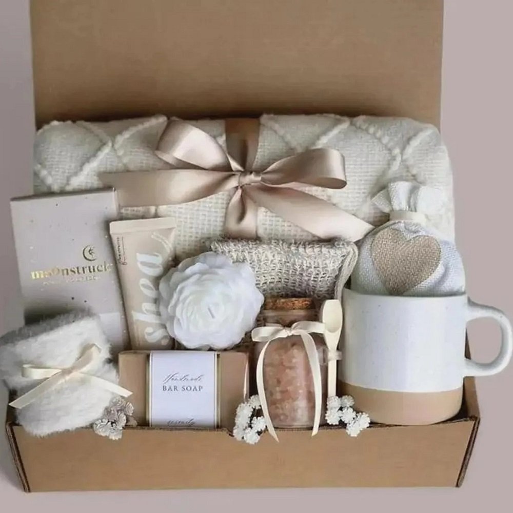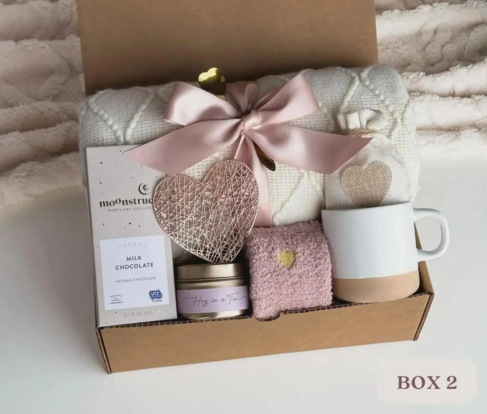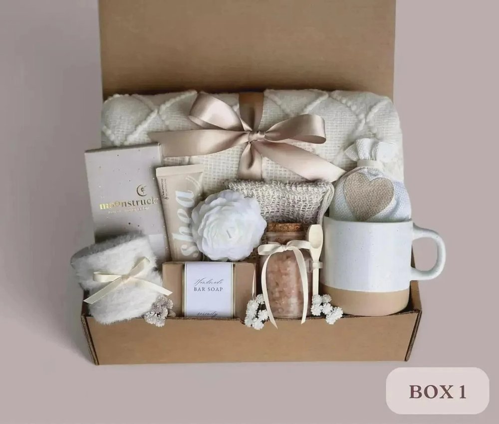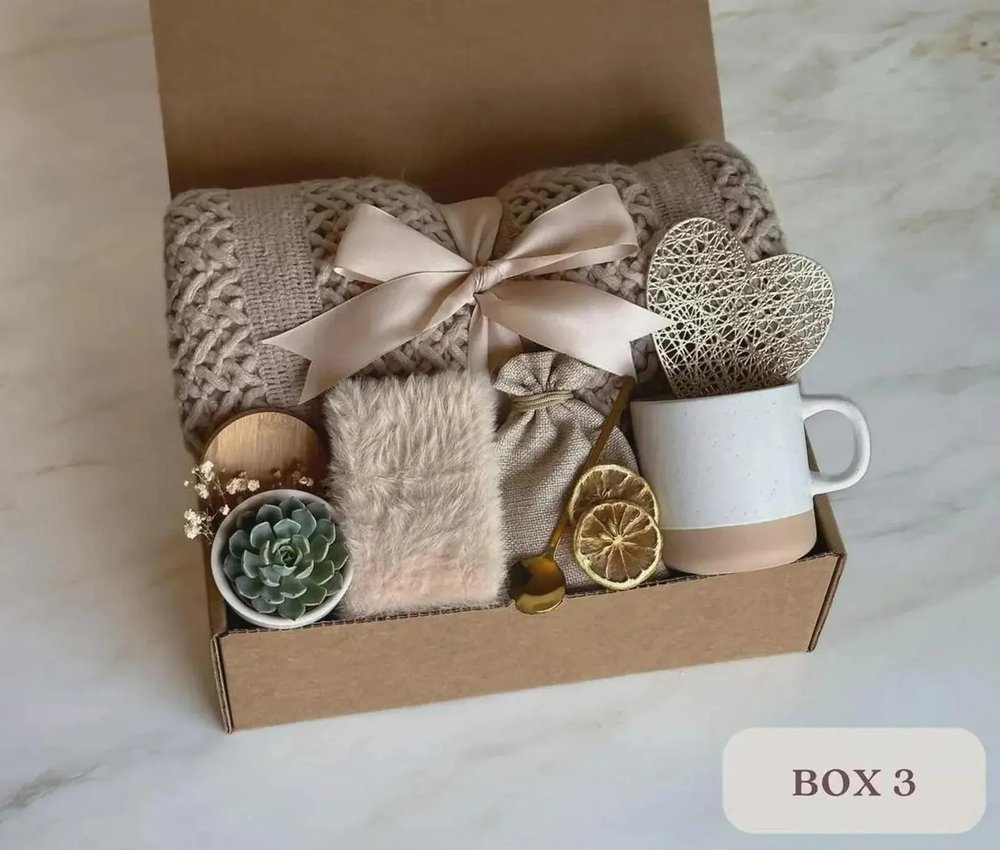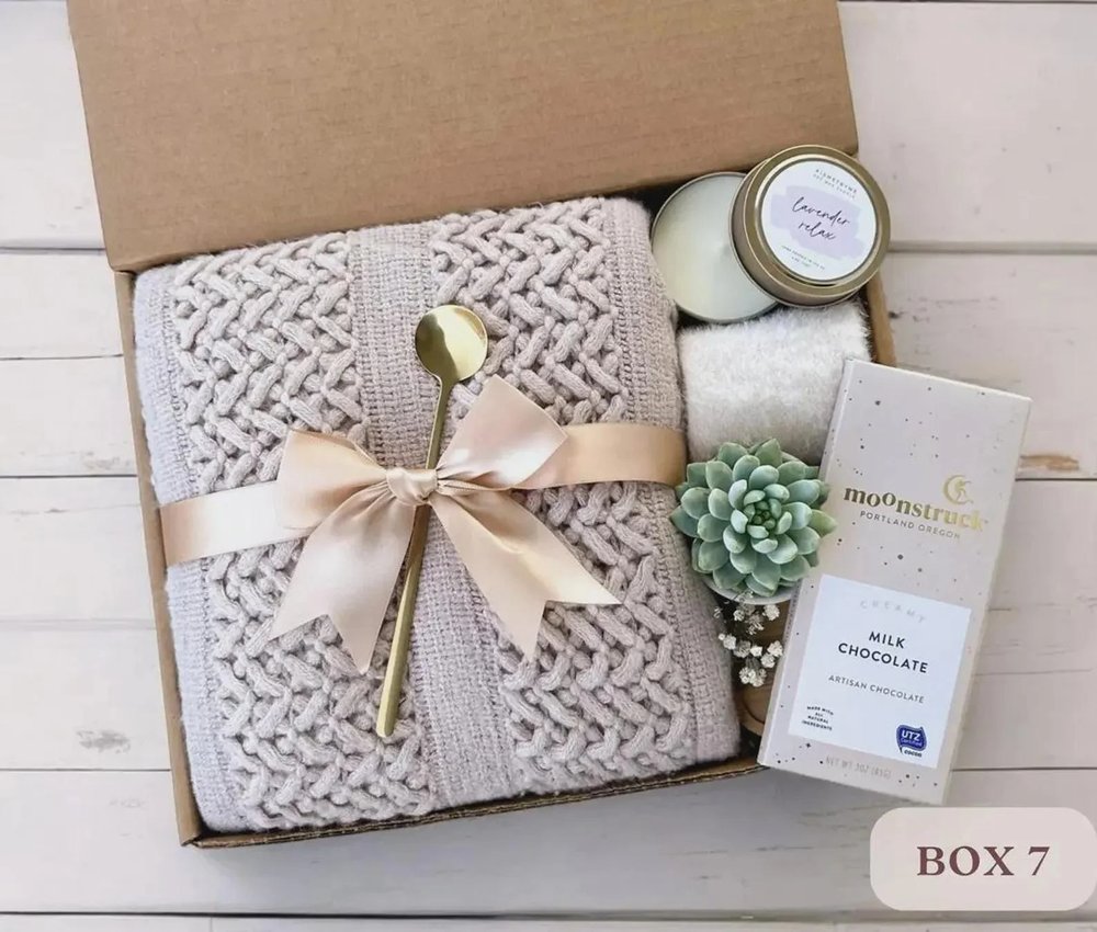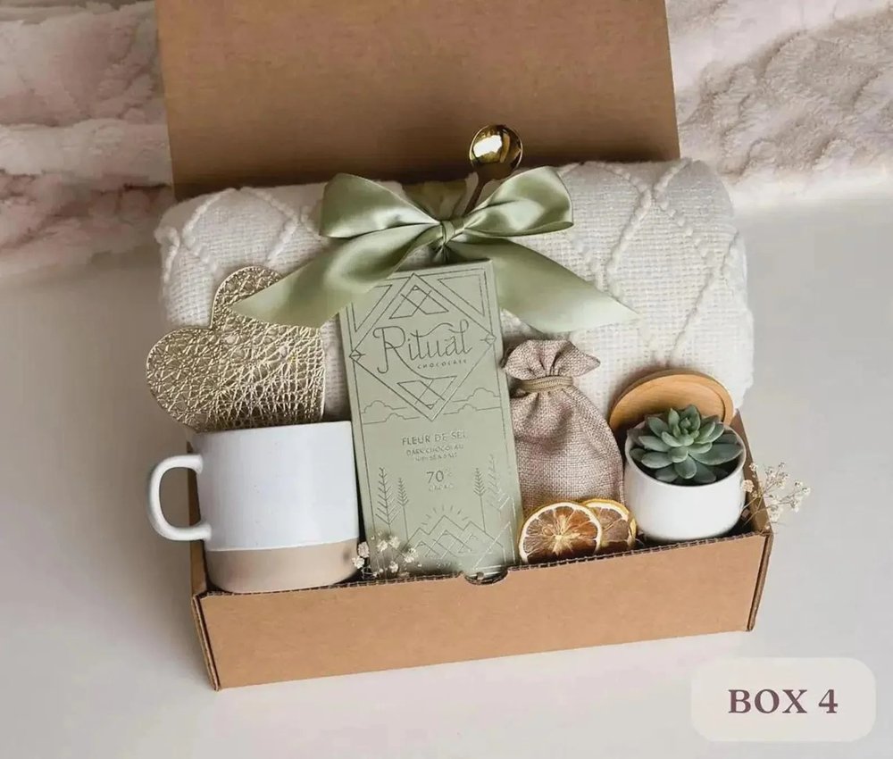 BOX 1: ♥️ White Speckled Mug With Natural Clay Bottom ♥️ Knit Throw Blanket ♥️ Natural Soap ♥️ Soap Bag ♥️ Gourmet Chocolate ♥️ 2 servings of Chai or Herbal Tea in a cute Burlap Bag. ♥️ Velvet Fuzzy Socks ♥️ Rose Shaped Candle ♥️ Bath Salt in a bottle ♥️ Shea Hand Cream BOX 2: ♥️ Knit Throw Blanket (50x70) ♥️ Ceramic Speckled Mug ♥️ Heart Embroidered Fuzzy Socks ♥️ Hug in a Tin Hand-poured Lavender Soy Candle ♥️ Gourmet Chocolate ♥️ 2 servings of Herbal Tea in a cute Burlap Bag. ♥️ Heart Shaped Coaster ♥️ Gold Spoon BOX 3: ♥️ Boho Taupe Knit Blanket ♥️ Beige Fuzzy Socks (one size fits most) ♥️ White Speckled Ceramic Mug ♥️ 2" Live Succulent w Ceramic Pot ♥️ 2 Servings of Herbal tea in bag ♥️ Gold Spoon ♥️ Heart Coaster BOX 4: ♥️ Throw Blanket (50x70") ♥️ Ribbed Mug OR Clay Mug ♥️ 2 servings of Chai or Herbal Tea in a cute Burlap Bag. ♥️ Mini Cute Succulent with Ceramic Pot (2.5 inches). ♥️ Gourmet Chocolate