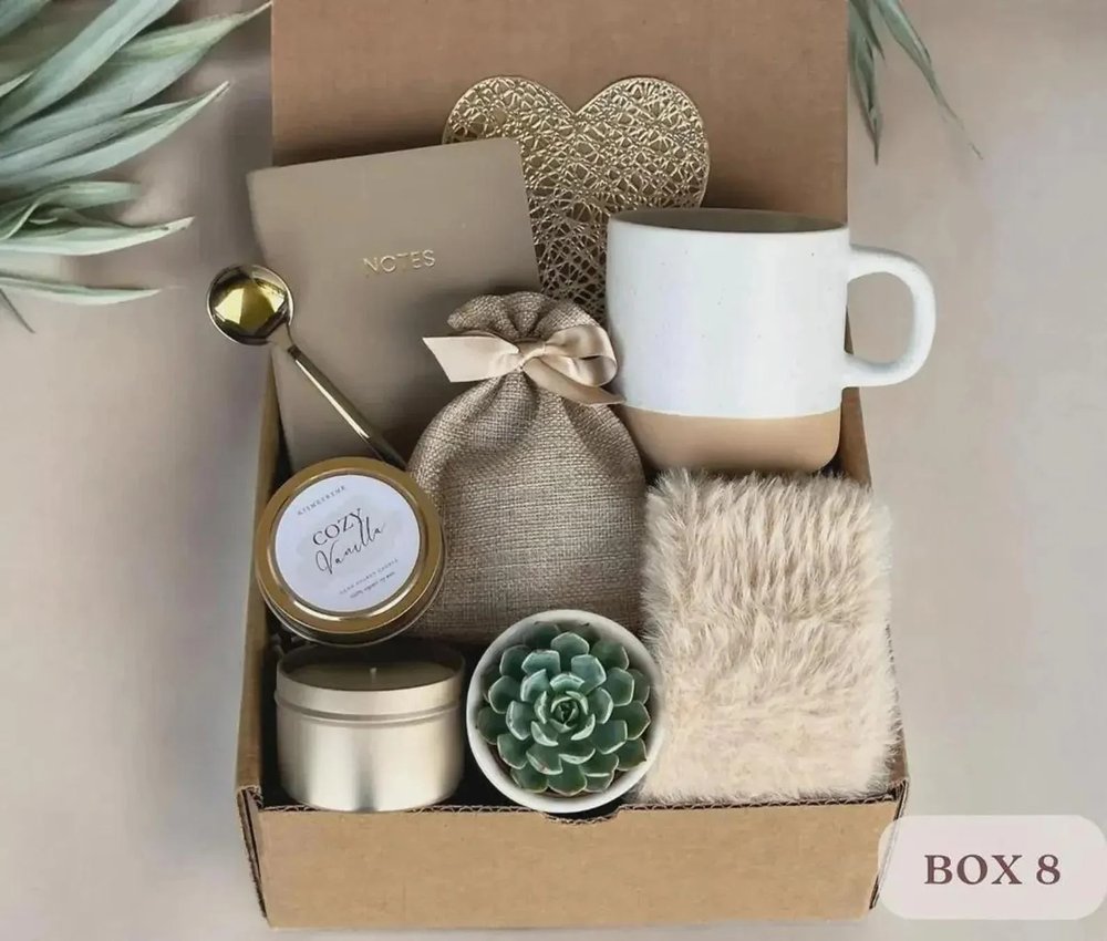 BOX 5: ♥️ Throw Blanket (50x70") ♥️ Cream Tumbler ♥️ 2 servings of Chai or Herbal Tea in a cute Burlap Bag. ♥️ Unisex Cozy Wool Socks. ♥️ Gourmet Chocolate. ♥️ Gold Spoon. BOX 6: ♥️ White Speckled Mug With Natural Clay Bottom ♥️ Vegan Leather A6 Notebook, Lined. ♥️ Fluffy Socks, women one size ♥️ Hand-poured Lavender Soy Candle ♥️ 2 servings of Chai or Herbal Tea in a cute Burlap Bag. ♥️ Mini live succulent or cacti in a white plastic pot ♥️ Gold Spoon BOX 7: ♥️ Throw Blanket (50x70) ♥️ Mini Succulent in ceramic pot 2 inches ♥️ Gourmet Chocolate ♥️ Hug in a Tin Hand-poured Lavender Soy Candle ♥️ Stainless Steel Gold Spoon. ♥️ Velvet Fuzzy Socks ♥️ Stainless Steel Gold Spoon BOX 8: ♥️ White Speckled Mug With Natural Clay Bottom ♥️ Vegan Leather A6 Notebook, Lined. ♥️ Fluffy Socks, women one size ♥️ Hand-poured Lavender Soy Candle ♥️ 2 servings of Chai or Herbal Tea in a cute Burlap Bag. ♥️ Mini live succulent or cacti in a white plastic pot ♥️ Gold Spoon