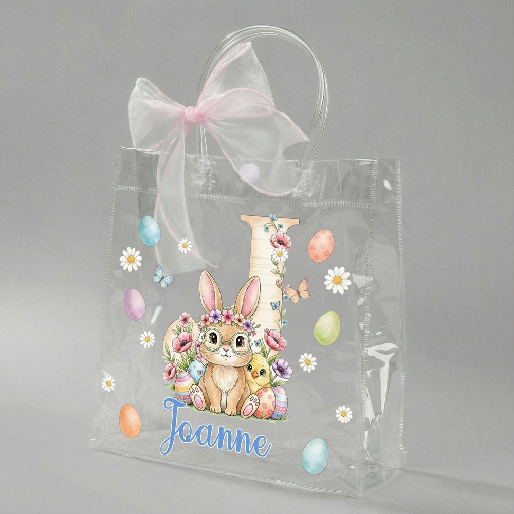 The bag showcases an adorable bunny wearing a flower crown and glasses, cuddling a little chick, surrounded by colorful Easter eggs, daisies, and butterflies, adorned with blossoms. A delightful touch of spring magic!