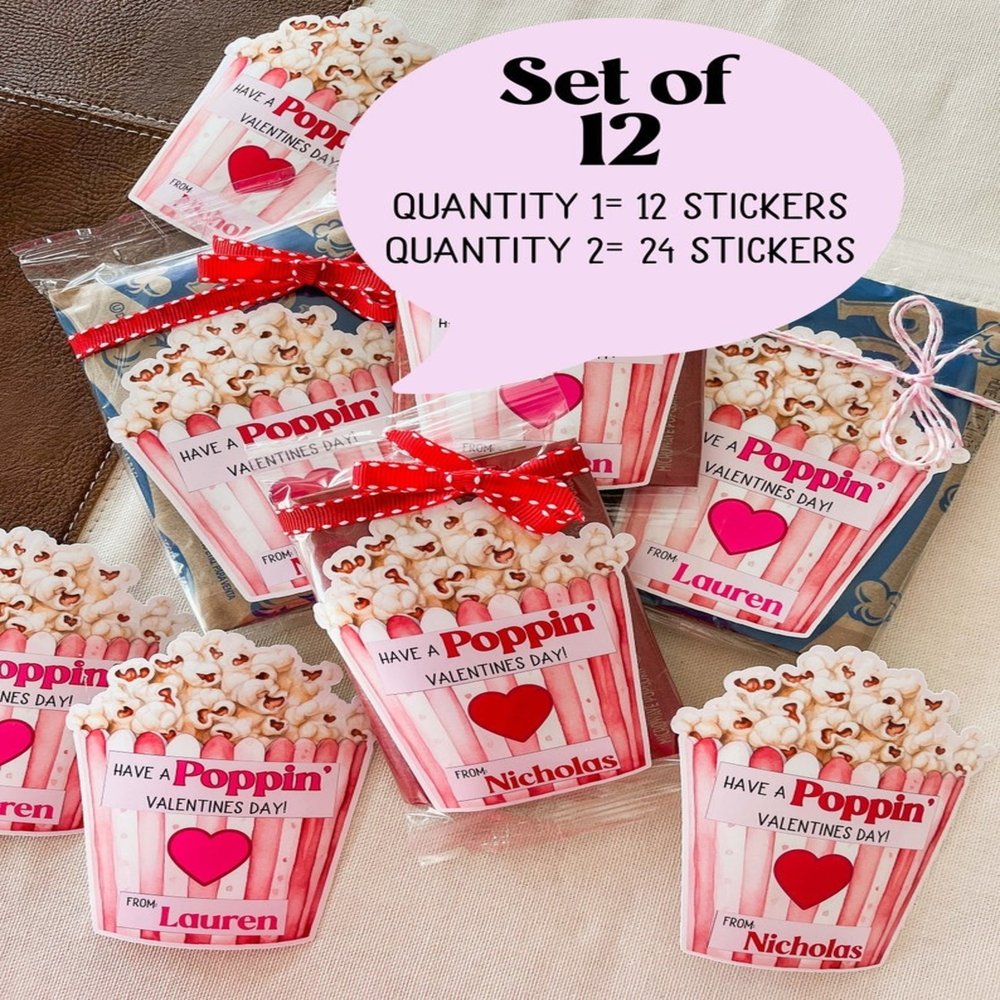 Custom Name Labels for Kids, Personalized Valentine’s Day Popcorn Stickers, Boys and Girls, Perfect Classroom Gifts