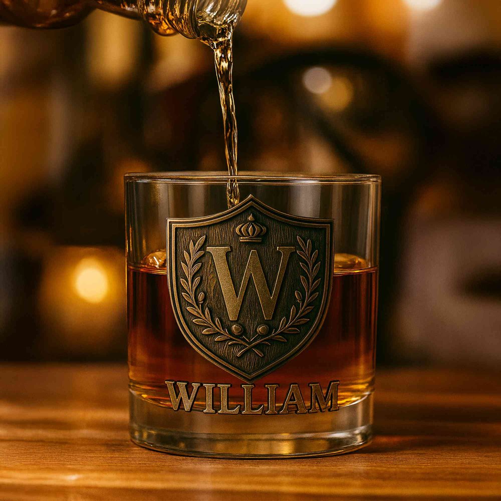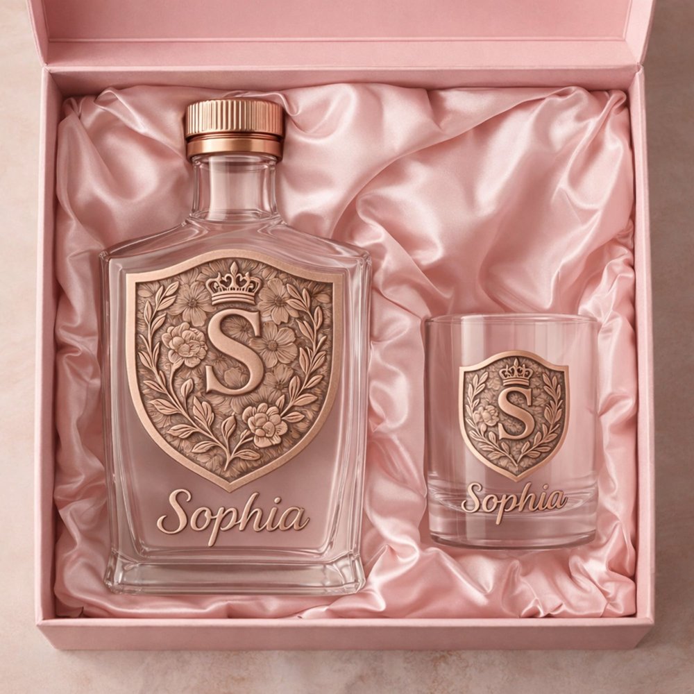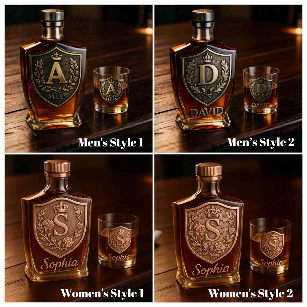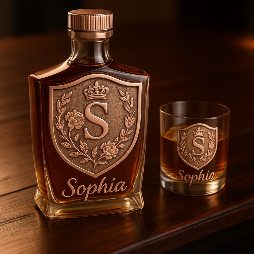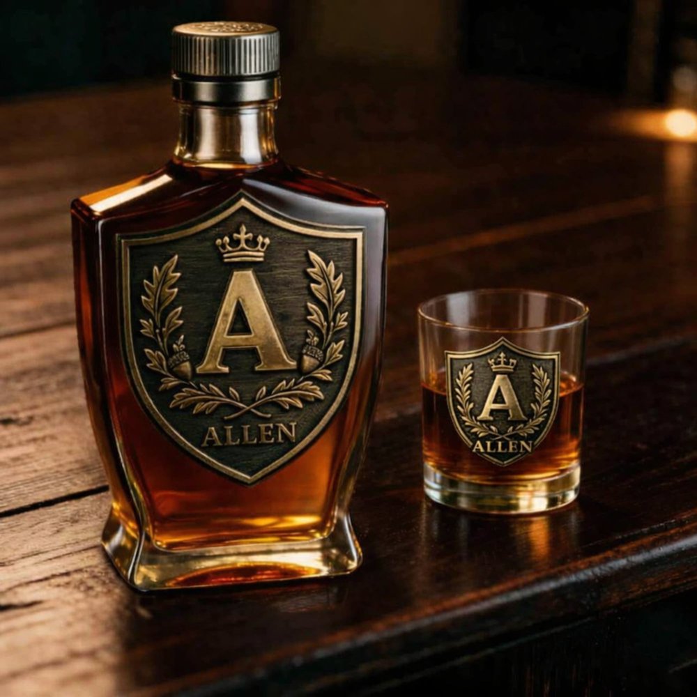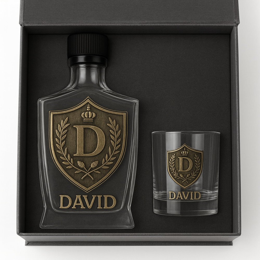 Discover a unique blend of quality and personalization with our Custom Whiskey Bottle and Glass Set. Each set features an intricately designed initial crest alongside personalized name engraving, allowing for a meaningful touch that reflects individual identity and emotional significance.