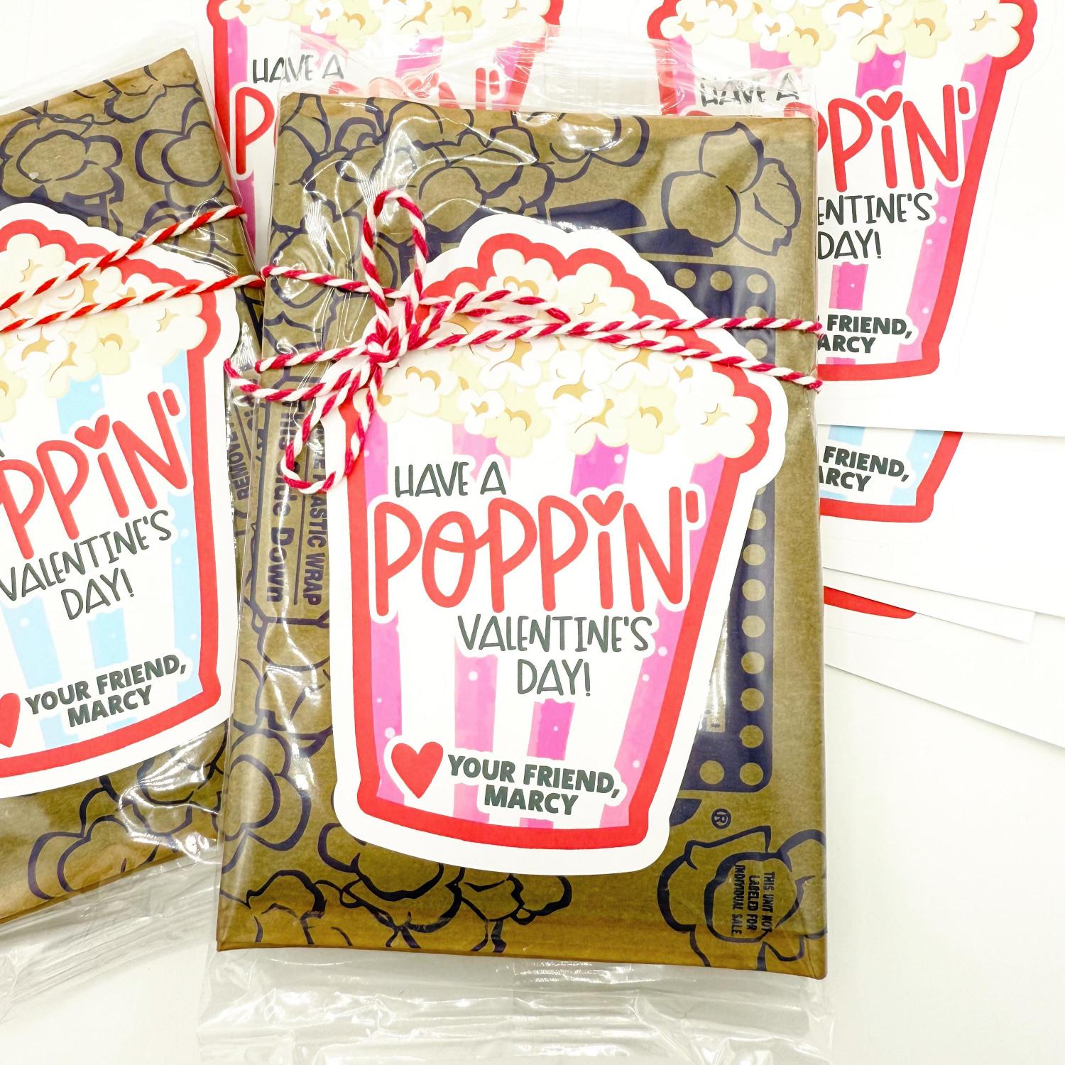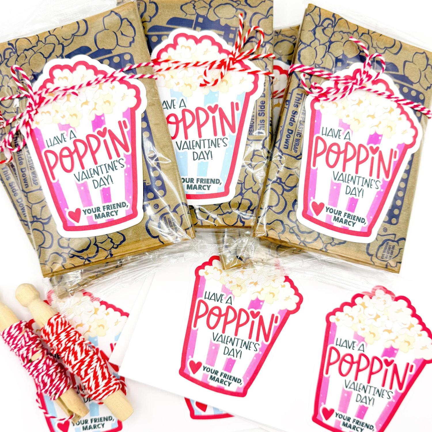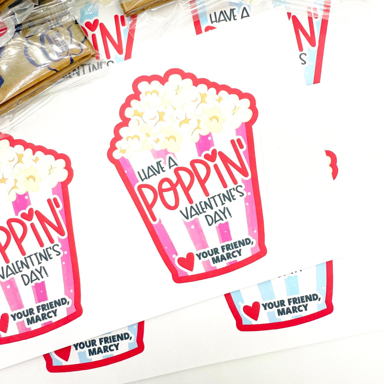 Each sticker is approx. 3.25" wide x 4.3" tall (about 8.3 x 10.9 cm), printed on premium matte label paper with strong, kid-friendly adhesive backing. The design features bright, cheerful colors and the cute phrase “HAVE A POPPIN VALENTINE'S DAY!” alongside the customizable name and optional bottom text. Just peel and stick—no cutting or extra steps needed! Popcorn & String are not included.