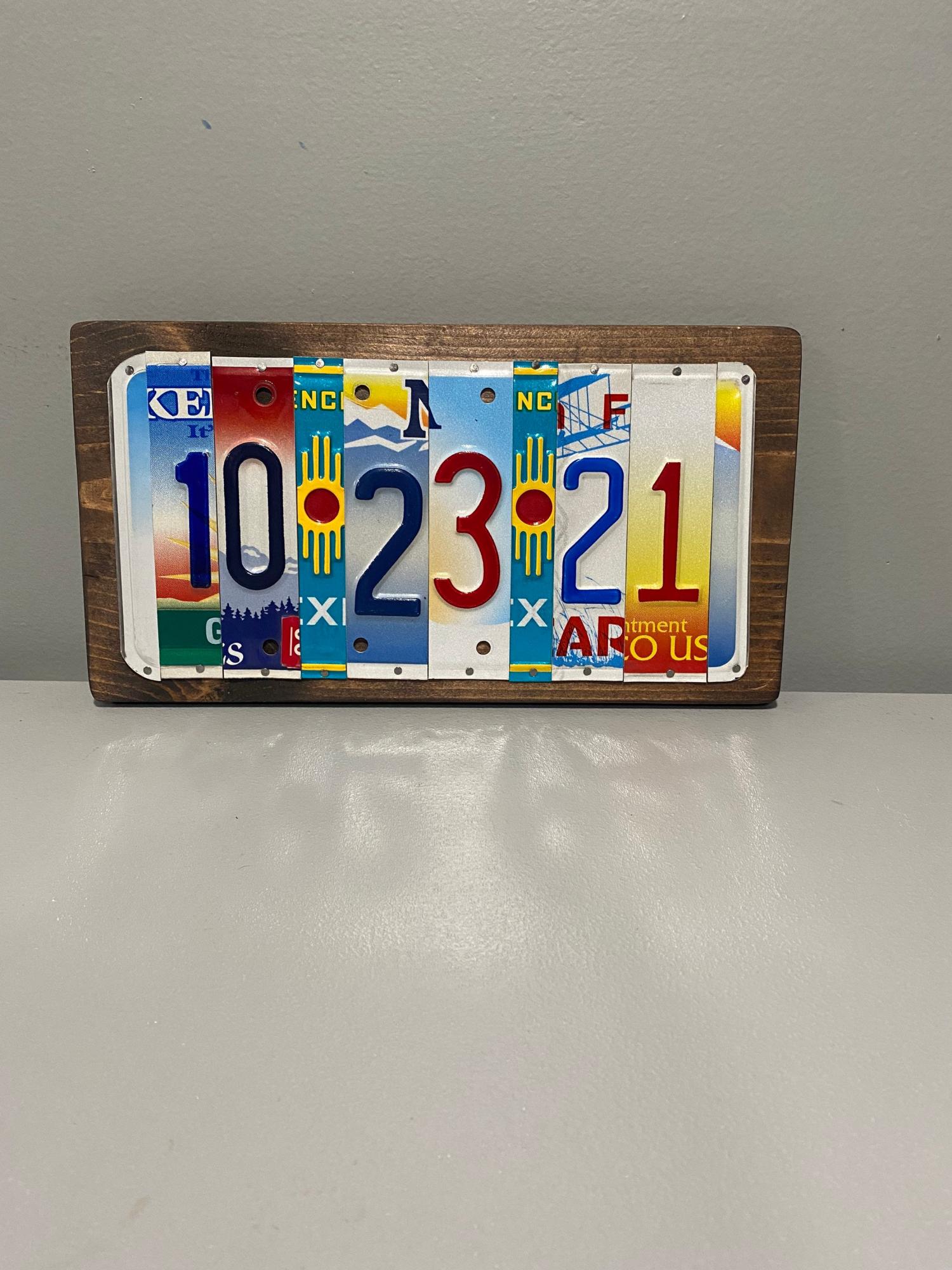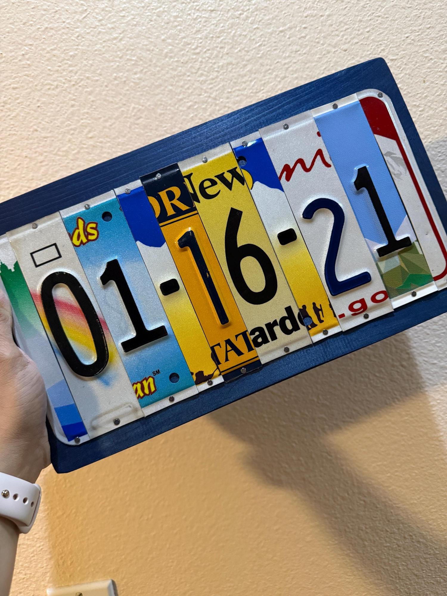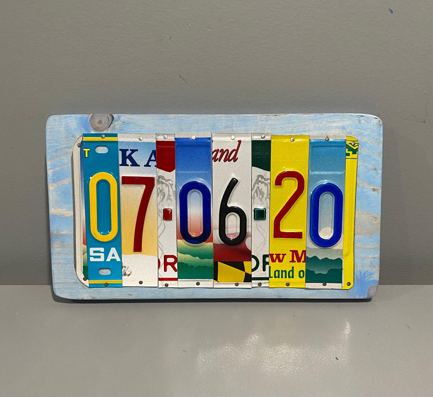 This handcrafted sign is made from upcycled. license plate fragments, each digit and dash cut from a unique plate to form your meaningful date (e.g., 06-01-19 is an 8 letter/number/dash/spacer sign). The vibrant, nostalgic mosaic showcases varied motifs and designs, framed in a rustic blue wooden base for a polished yet casual finish that complements any home decor.