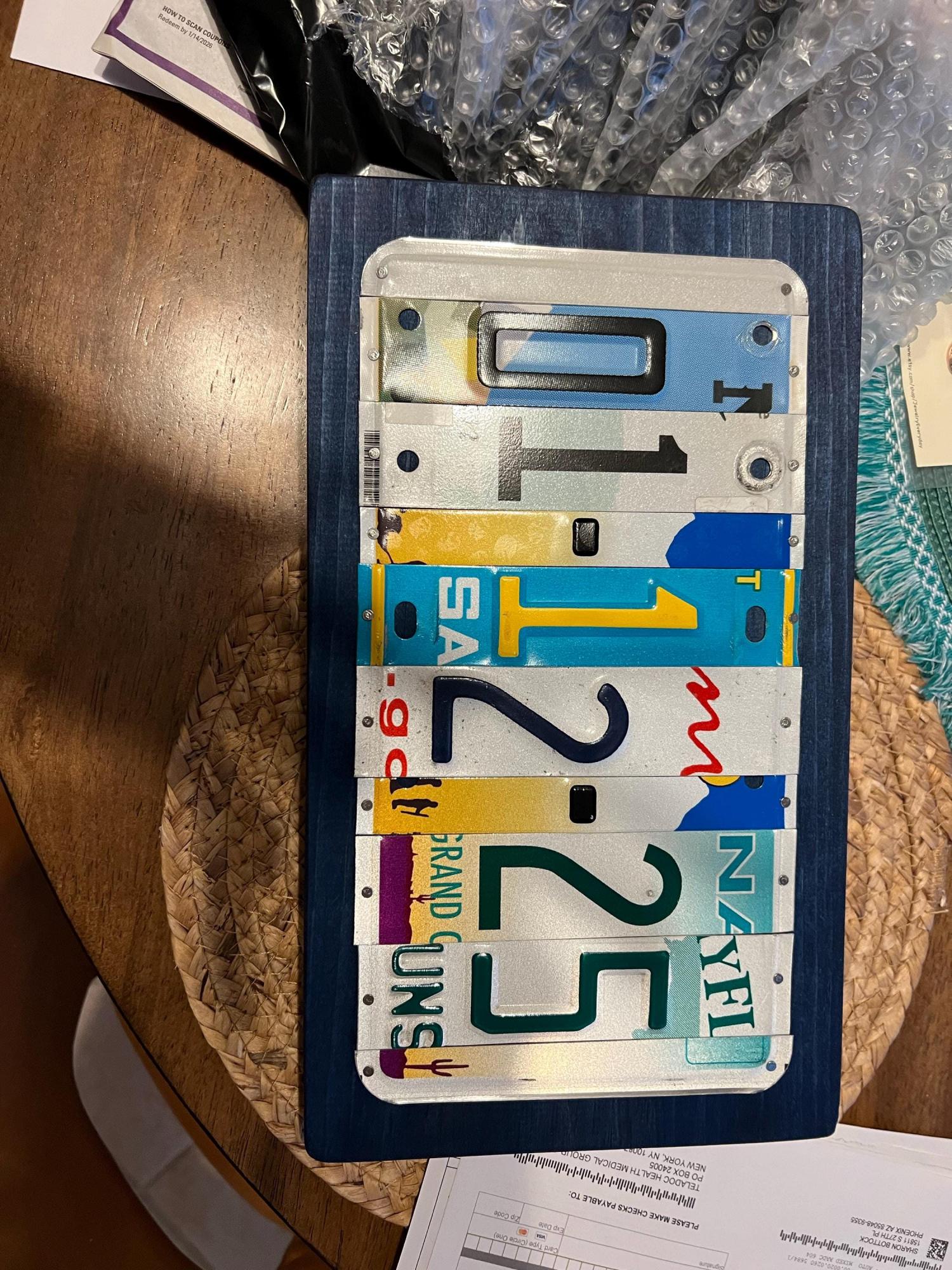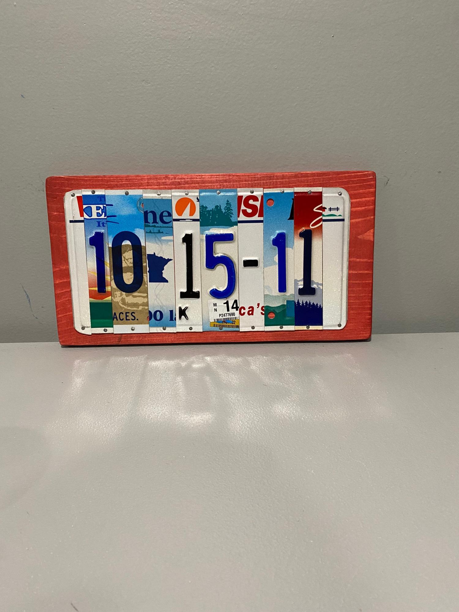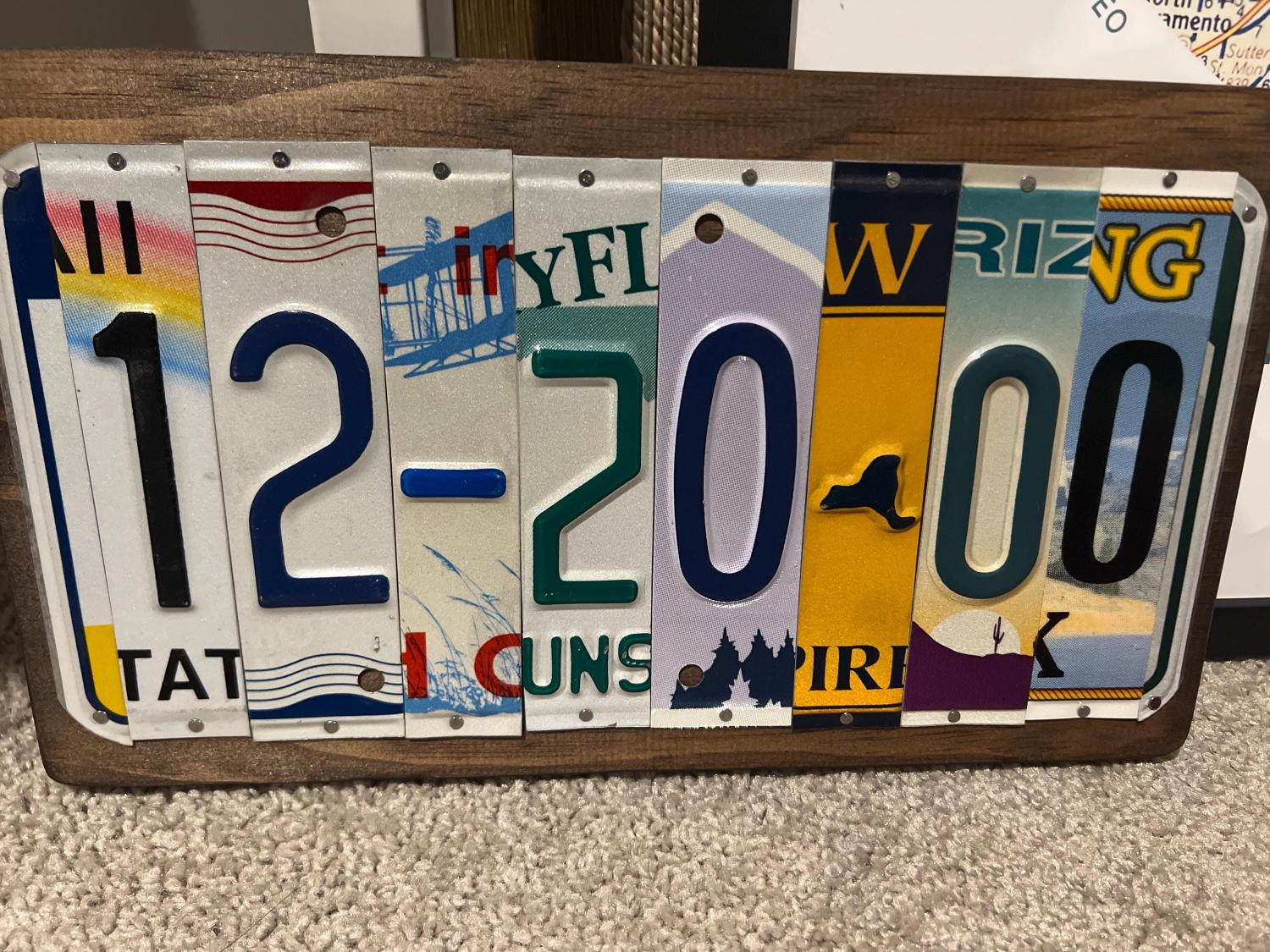 This handcrafted sign is made from upcycled. license plate fragments, each digit and dash cut from a unique plate to form your meaningful date (e.g., 06-01-19 is an 8 letter/number/dash/spacer sign). The vibrant, nostalgic mosaic showcases varied motifs and designs, framed in a rustic blue wooden base for a polished yet casual finish that complements any home decor.