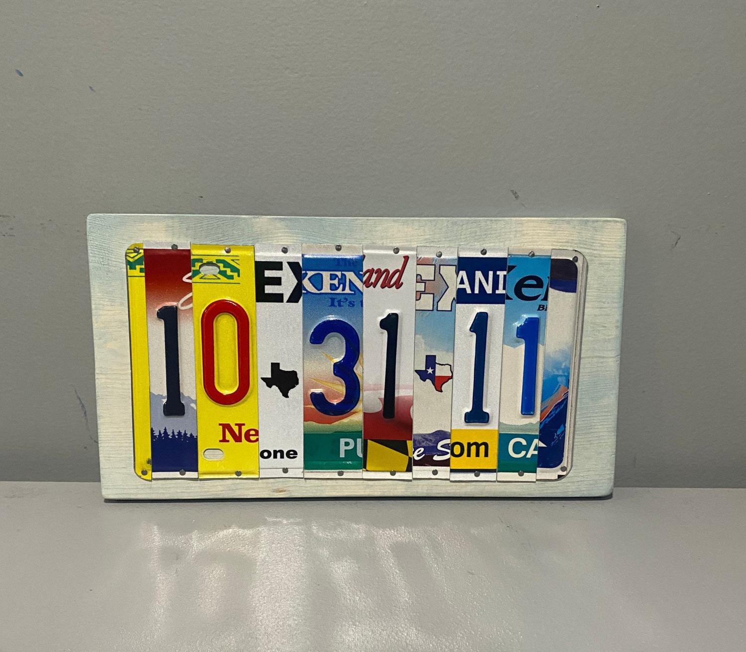 Customize with your wedding anniversary, childās birthday, or milestone date. But only include letters/numbers/dashes/spacers (these are considered a letter/number) in your order.The mix of vintage plates ensures each piece is one-of-a-kind, turning a simple date into a conversation-starting keepsake. Itās especially perfect for a 10th ātinā anniversary, as the repurposed metal plates align with the traditional tin gift theme.