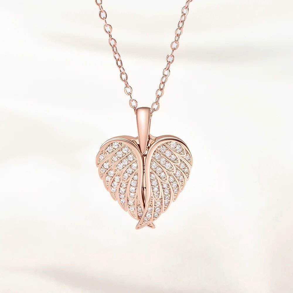 Angel wings jewelry is popular for symbolizing love, affection, harmony, and guardianship. This exquisite necklace features a heart-shaped locket adorned with sparkling CZ stones and delicate angel wings, creating a beautiful symbol of love, protection, and remembrance. Wear this pendant as a reminder that the person you love is your guardian angel, protecting and guiding you with positive energy and wishing to live out your life with grace.