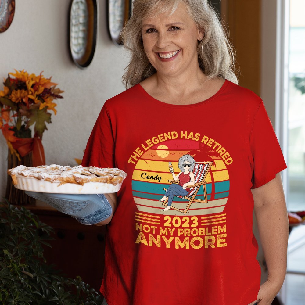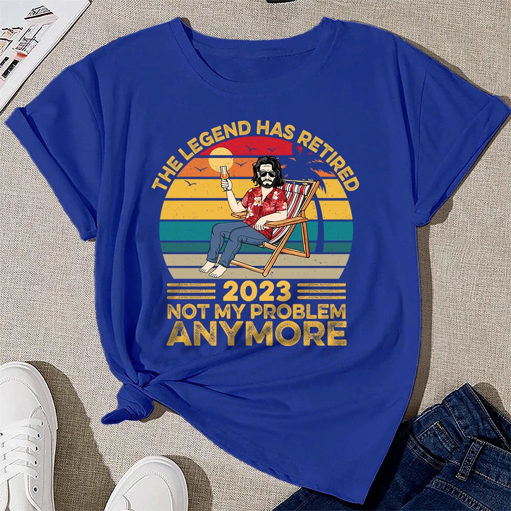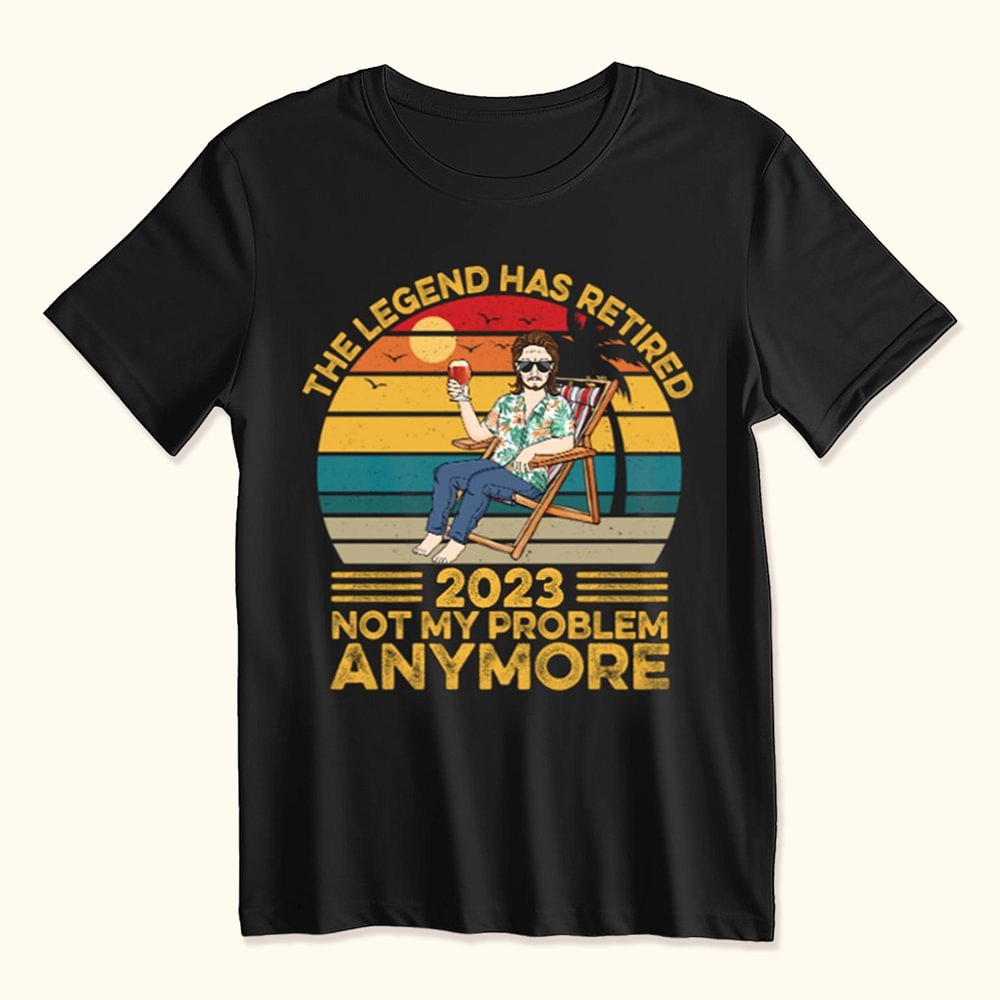 The clothes features a stylish retro design with the phrase "The Legend Has Retired Not My Problem Anymore" boldly displayed. It is a humorous and light-hearted way to celebrate the retiree's newfound freedom from work responsibilities. They can proudly wear this clothes and embrace their retired life.