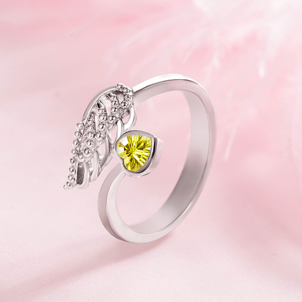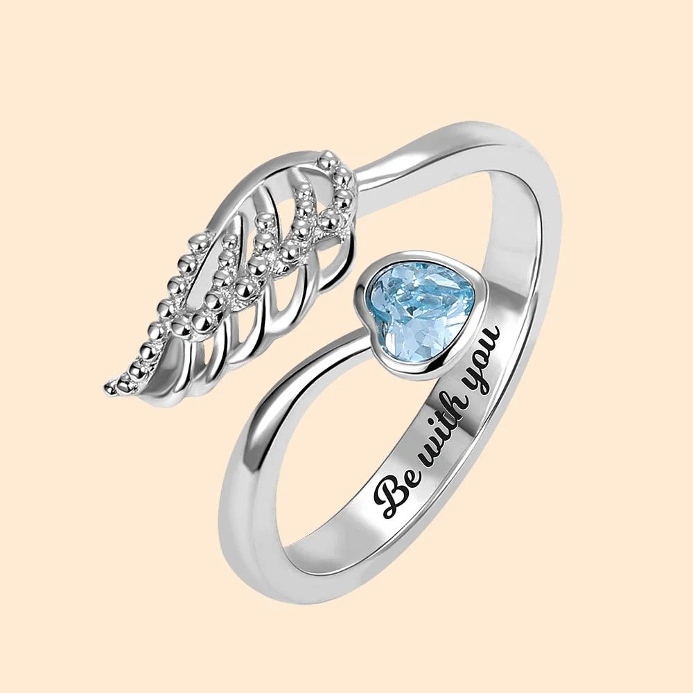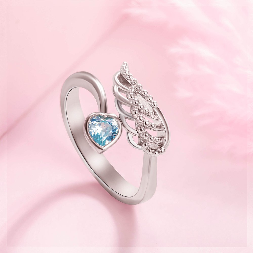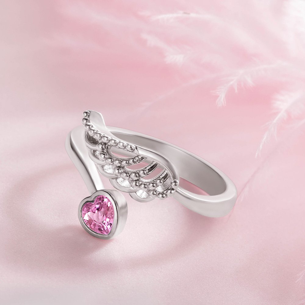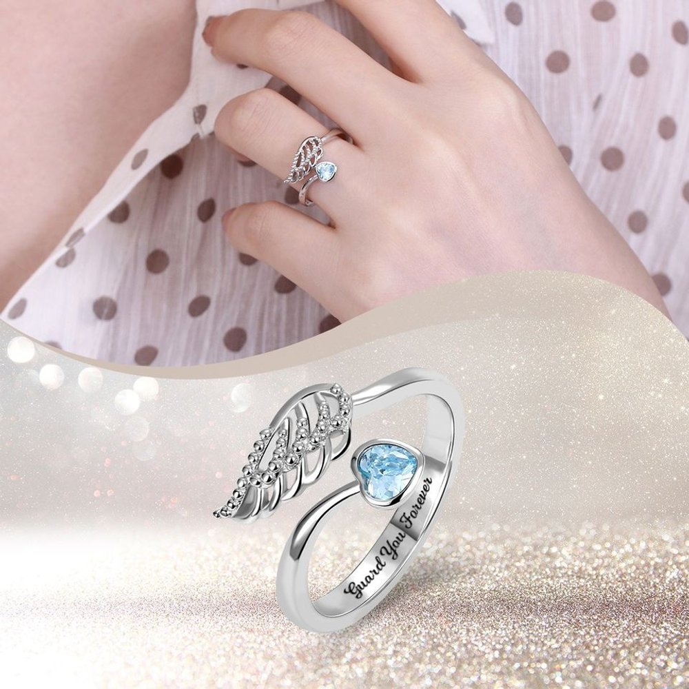 The combination of angel wings and a heart-shaped birthstone creates a stunning and symbolic piece of jewelry. This elegant design is not only visually appealing but also carries a heartfelt message of love and protection. The ring can be customized with engraved text, allowing you to add a special message or name. It serves as a meaningful way to express your feelings, making it a perfect gift for loved ones.