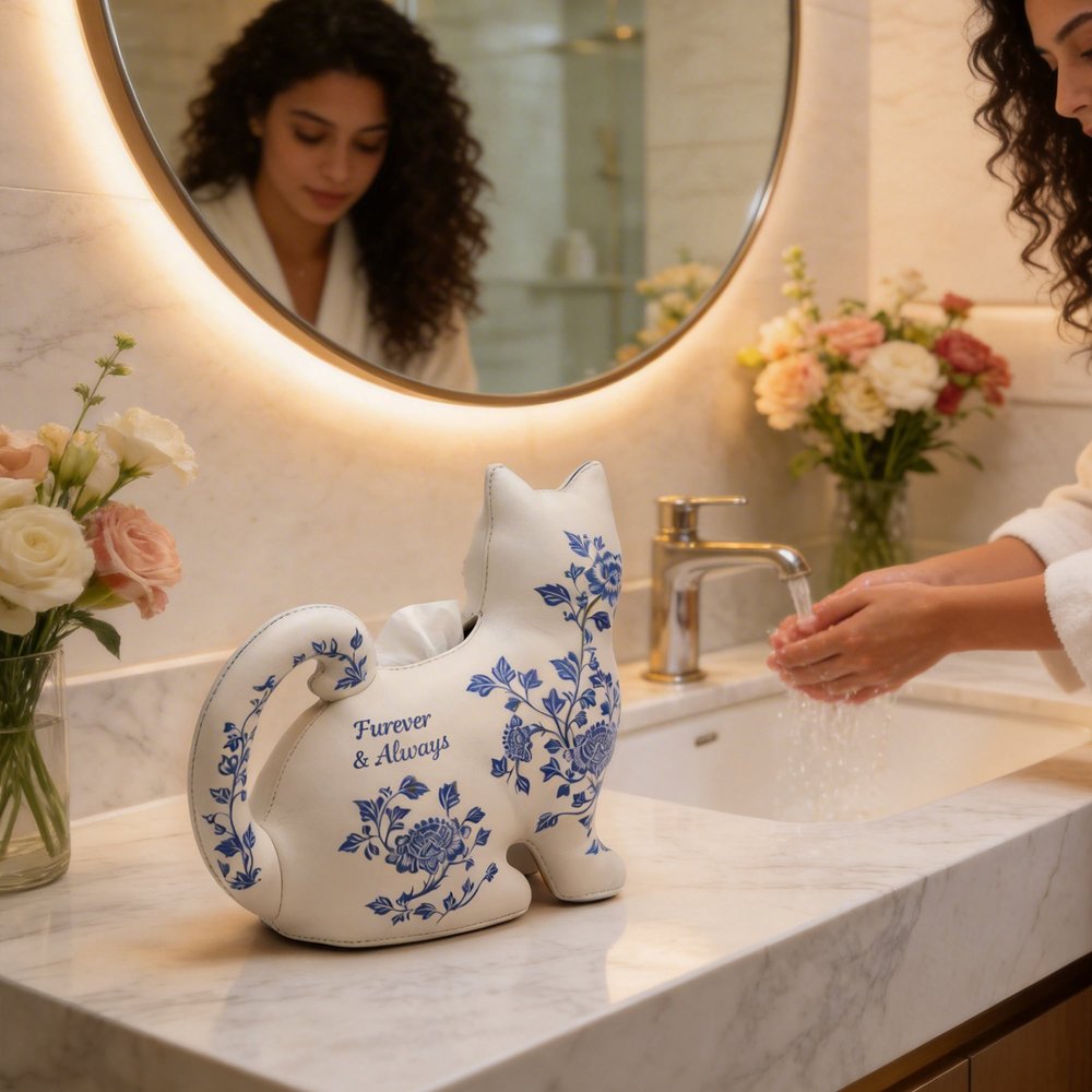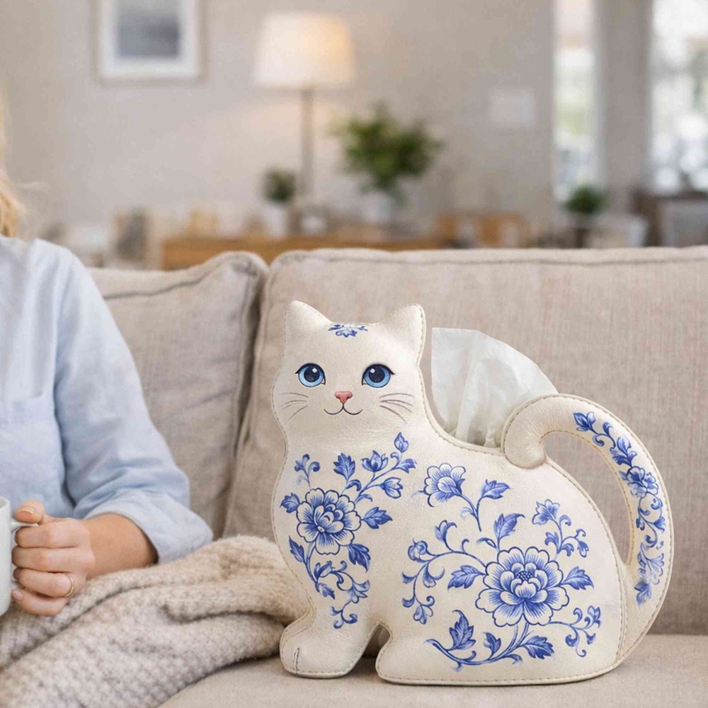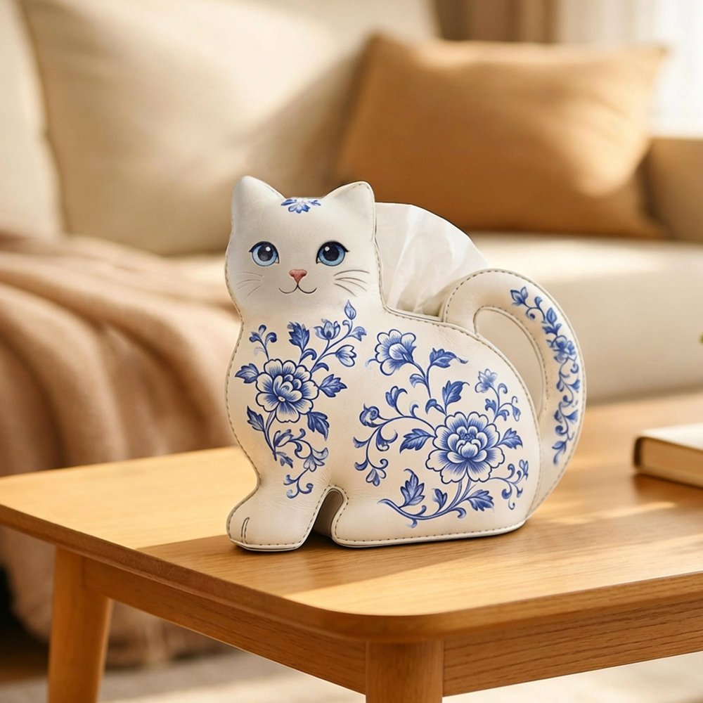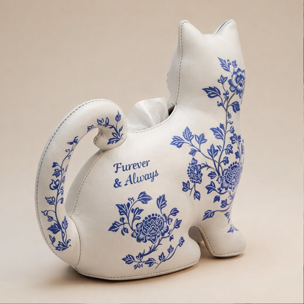 This Personalized Cat-Themed Tissue Box Cover features an adorable cat silhouette with a curled tail handle, adorned with elegant blue-and-white porcelain-style birth flower patterns, turning a mundane everyday item into a whimsical home accent that adds warmth and personality to any room while celebrating the recipient’s love for cats and unique decor.