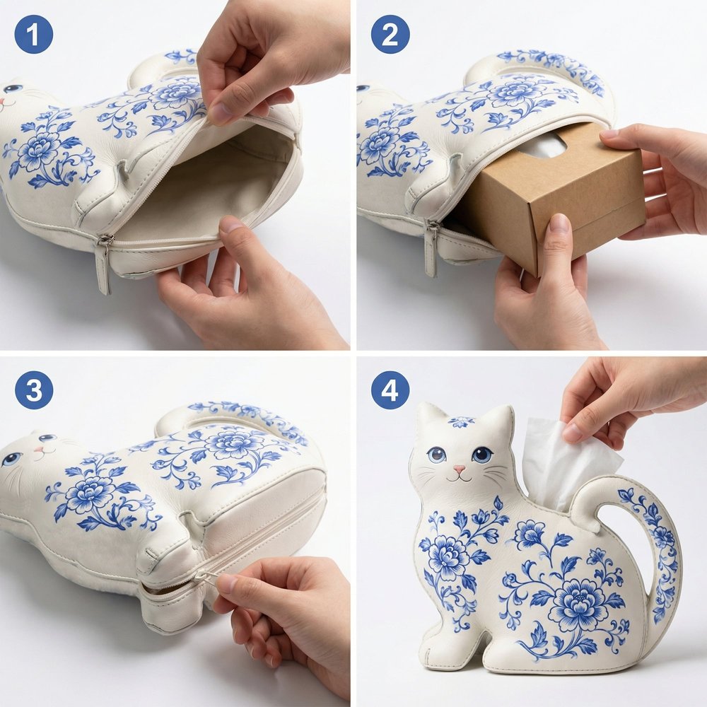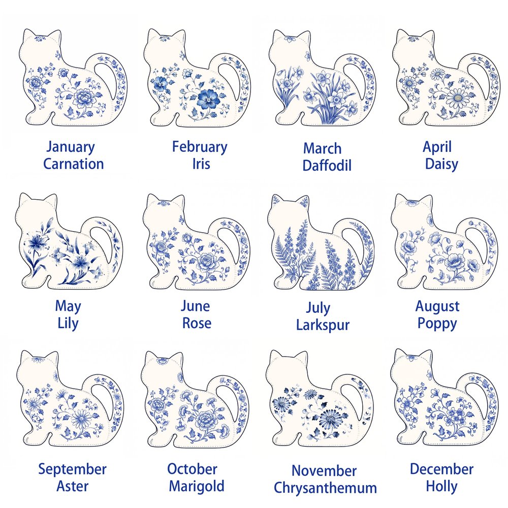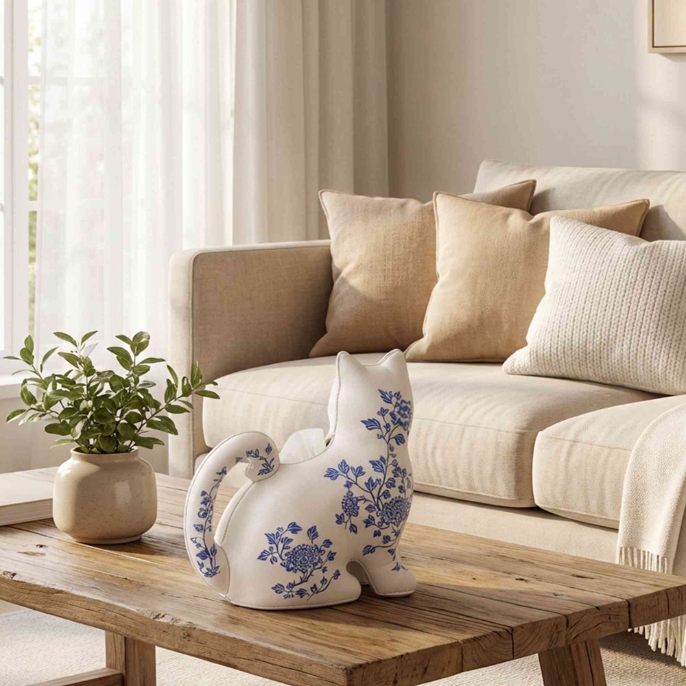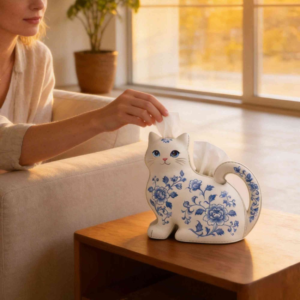This Personalized Cat-Themed Tissue Box Cover features an adorable cat silhouette with a curled tail handle, adorned with elegant blue-and-white porcelain-style birth flower patterns, turning a mundane everyday item into a whimsical home accent that adds warmth and personality to any room while celebrating the recipient’s love for cats and unique decor.