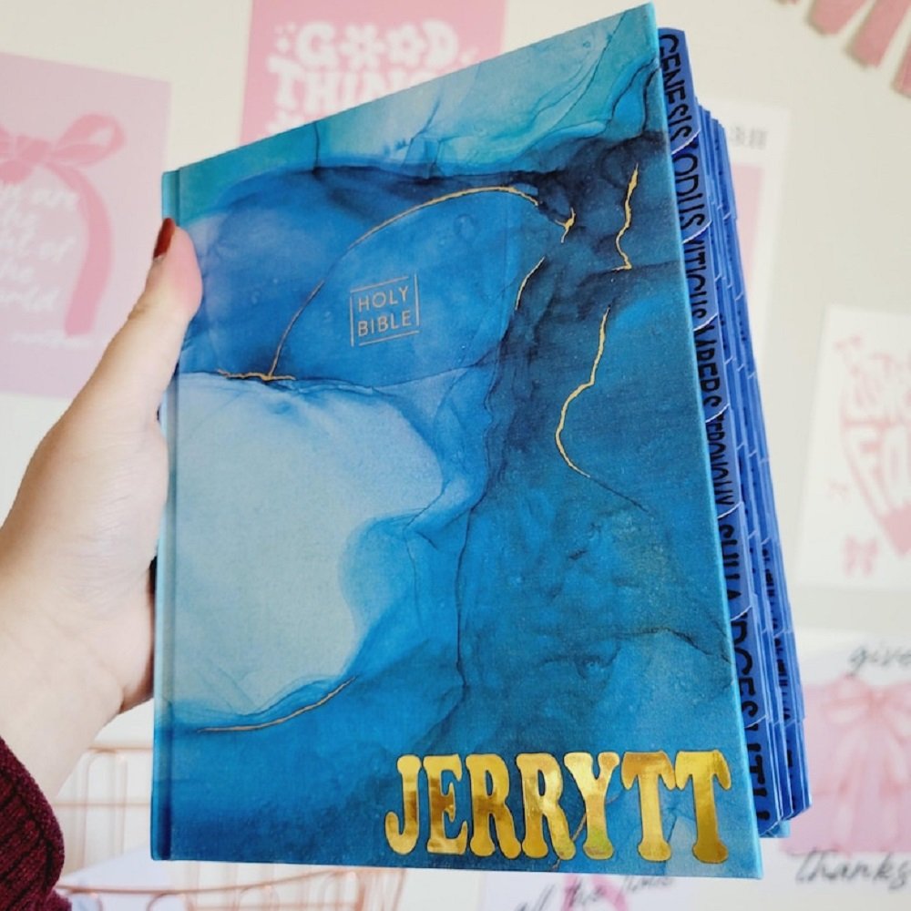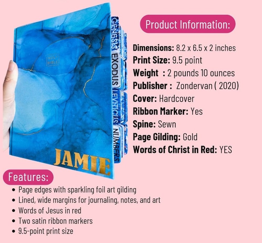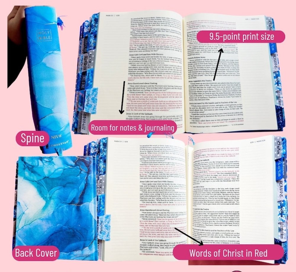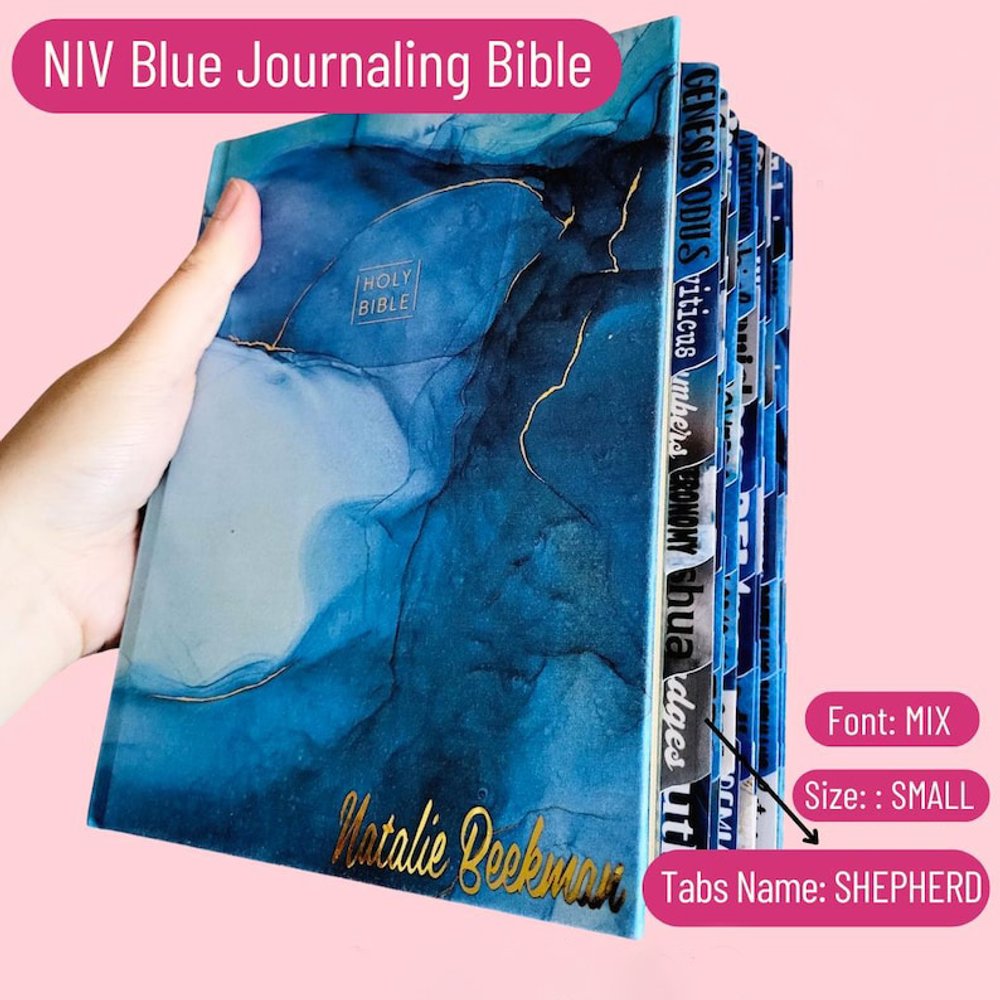 Elevate your spiritual journey with our Personalized Blue Marbled Leather Cover NIV Bible Collector's Edition! This beautifully crafted Bible combines aesthetic appeal with functional design. The soft and durable fabric features a breathtaking marbled cover that stands out, while shimmering gold foil art edges add a touch of luxury.