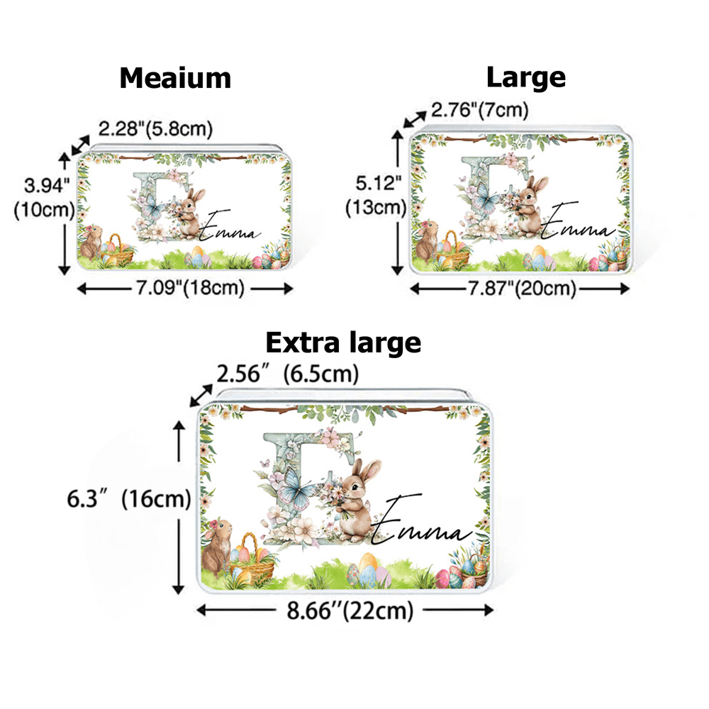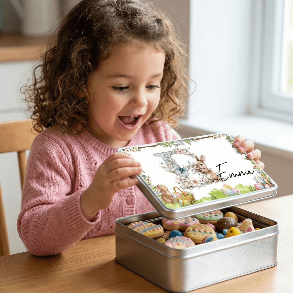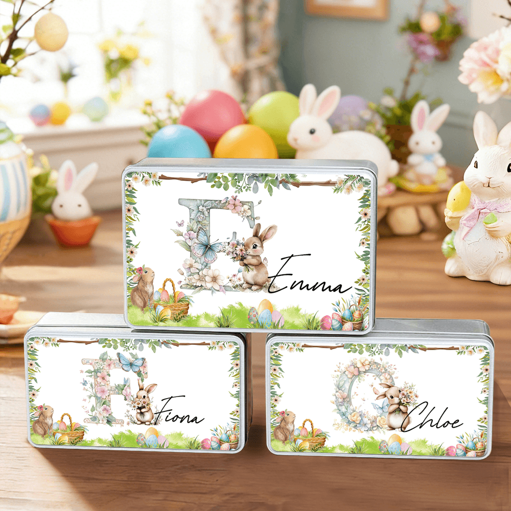 Personalized Butterfly Flower Cute Bunny Easter Biscuit Tin Box with Name and Initial Easter Party Gift for Children