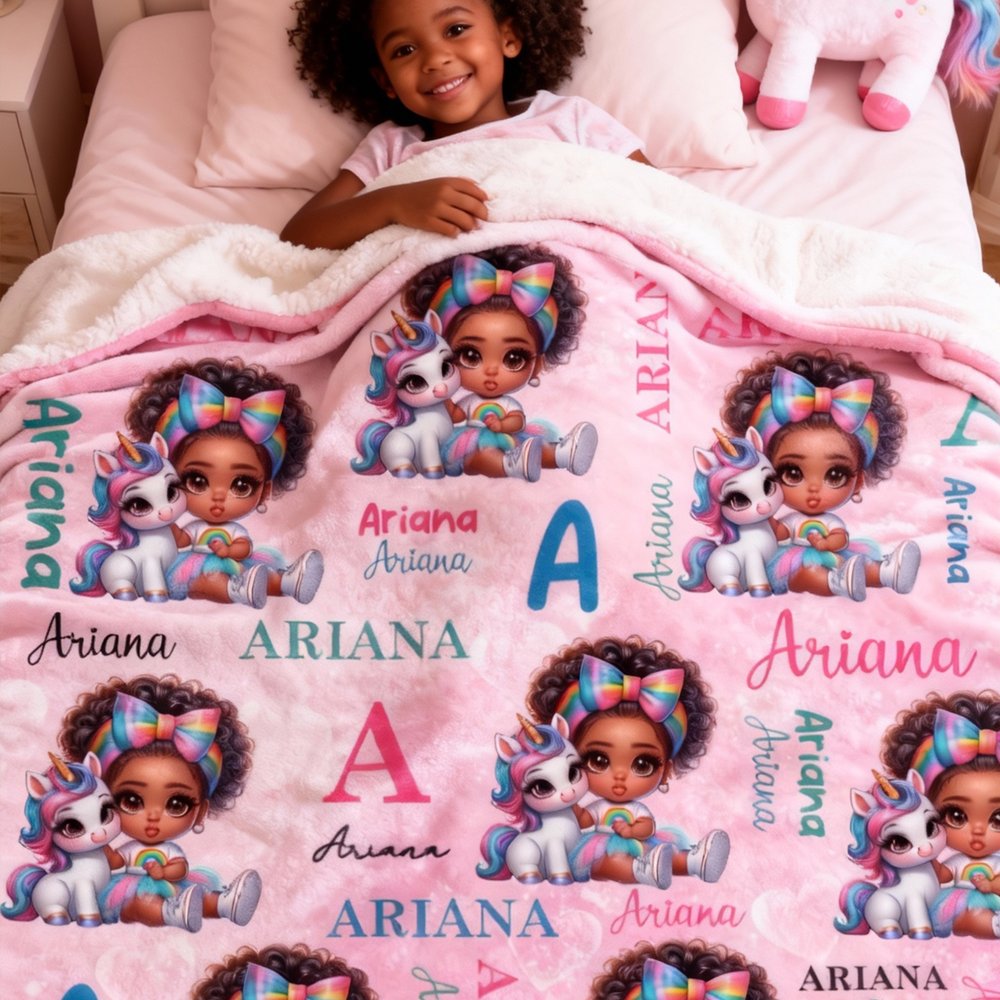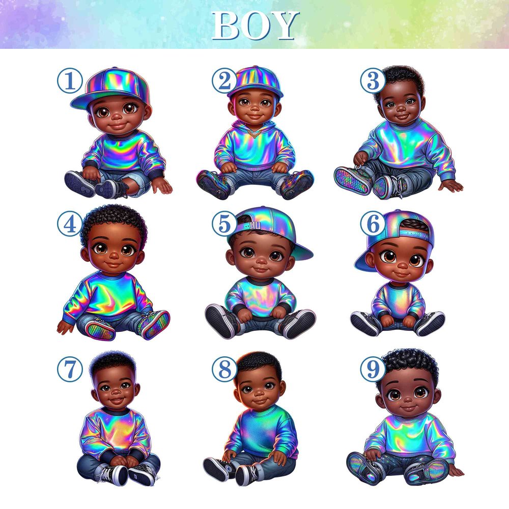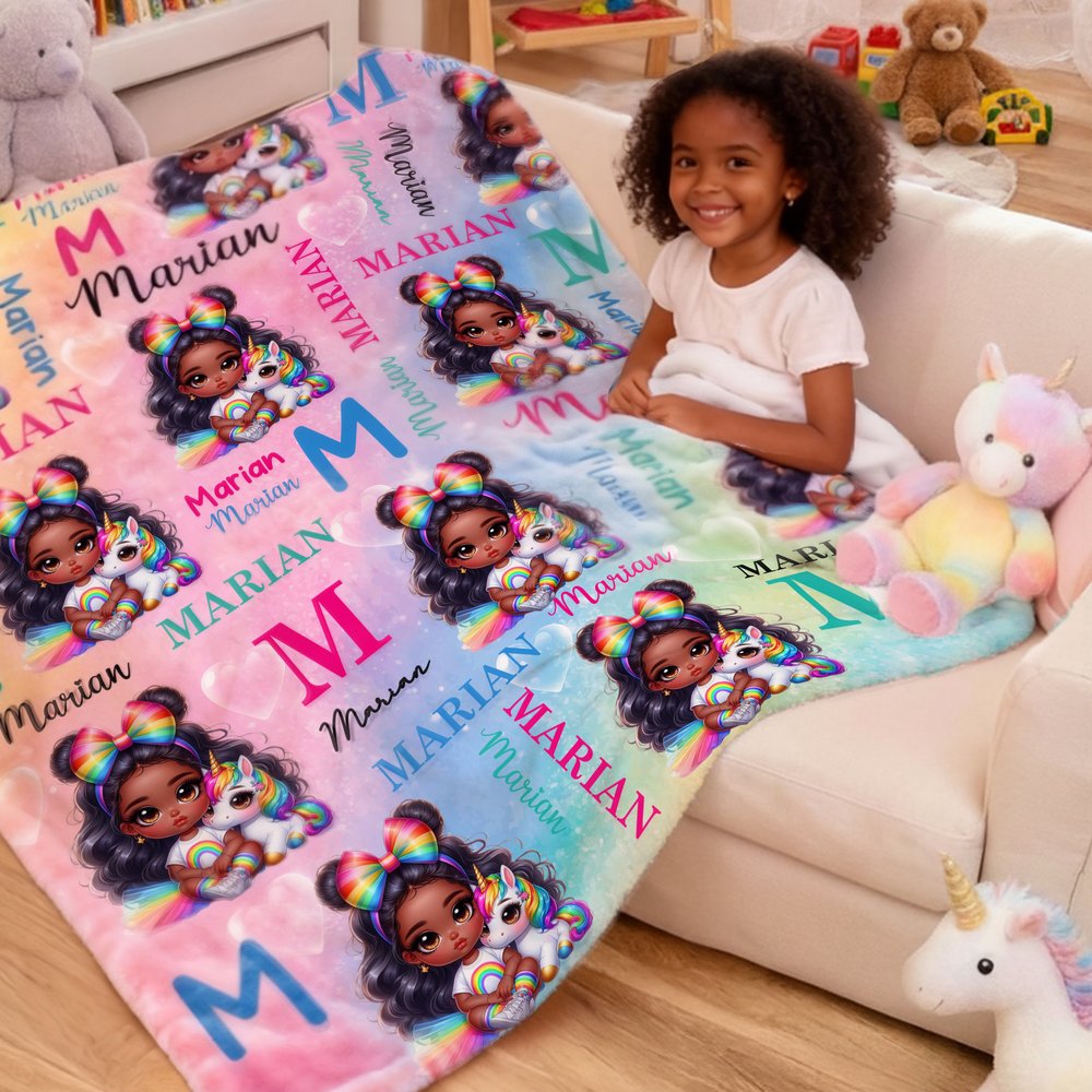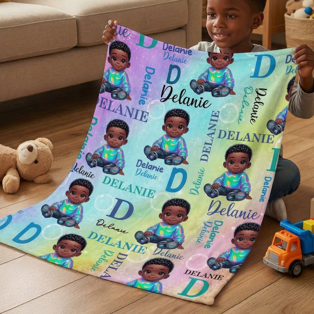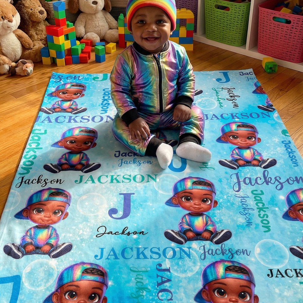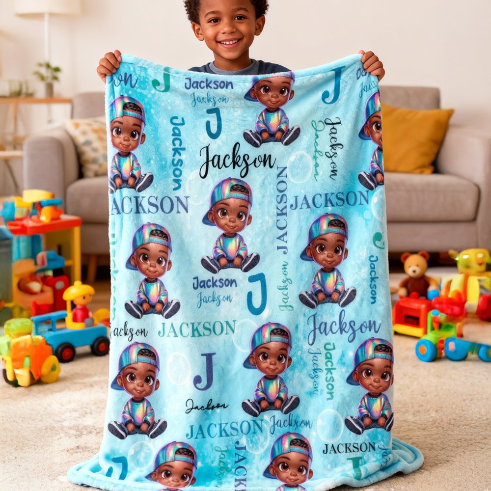 This blanket features a vibrant design centered around a cute, Black child, exuding charm and energy. Parents can choose from various adorable cartoon images that match their child's personality and style, along with customizable background colors and names. Each blanket can be personalized with the child's name, making it unique and meaningful—an expression of parental love and care.
