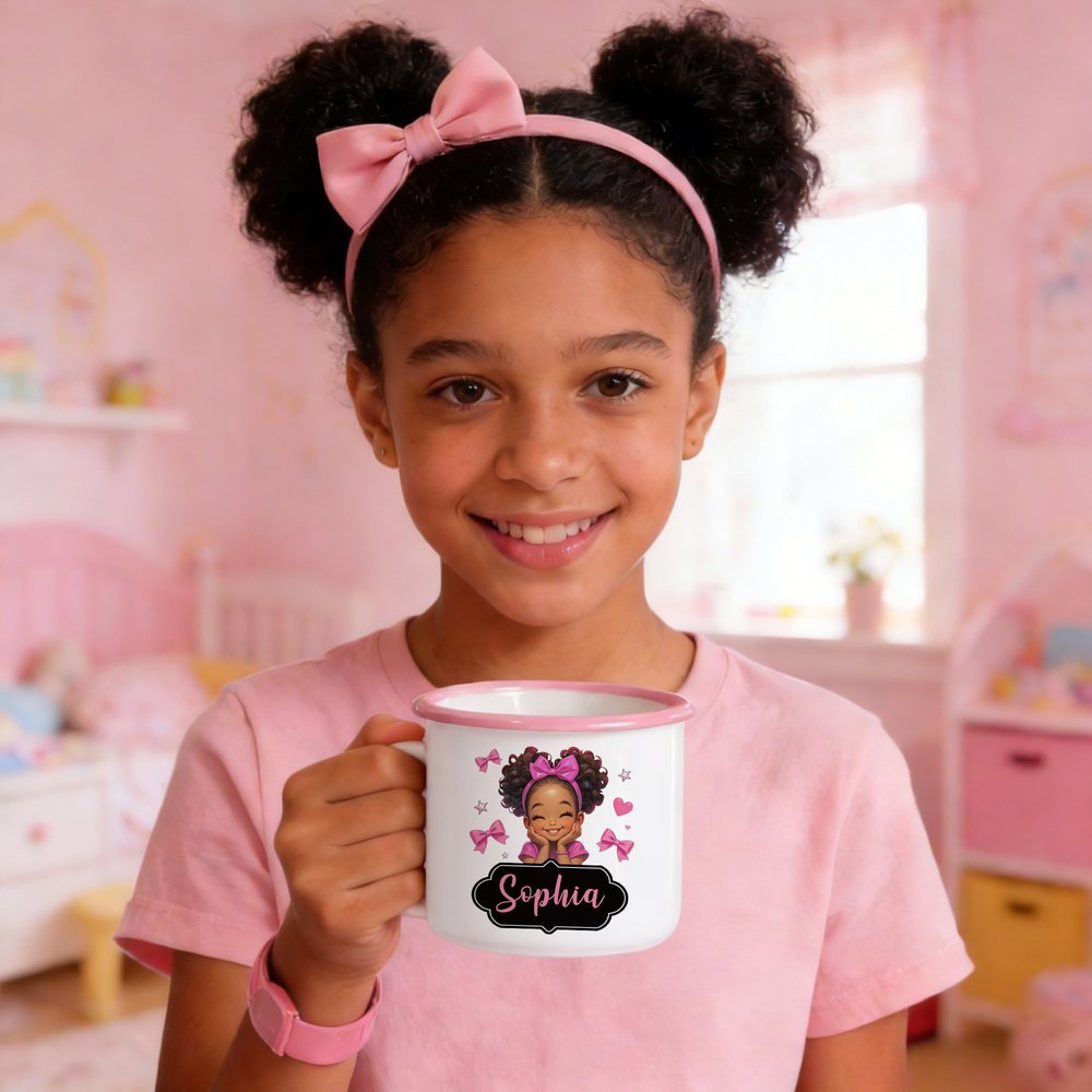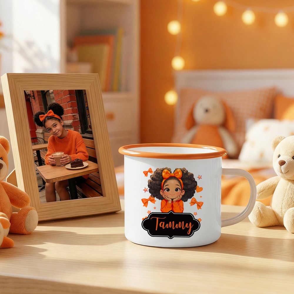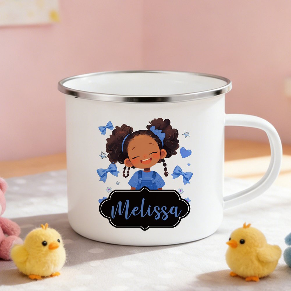 Personalized Cartoon Black Girl Enamel Mug with Name, Black Little Girl 12oz Enamel Cup, Birthday Gift for African American Little Girl