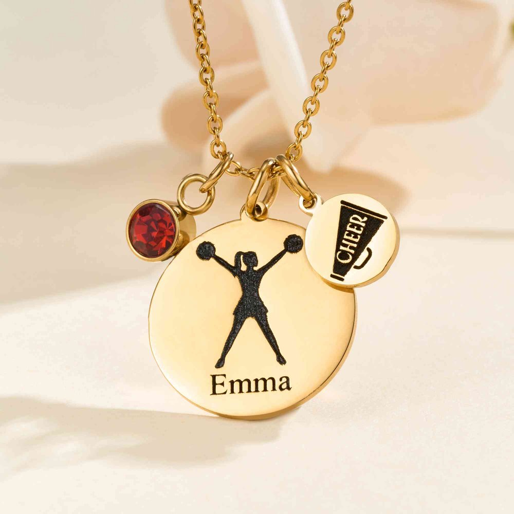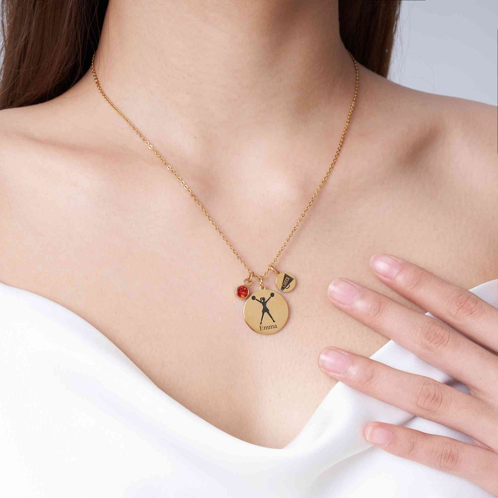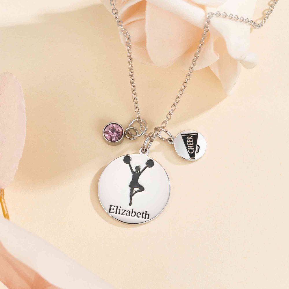 This exquisite Personalized Cheerleader Necklace with Birthstone and Name features a delicate, eye-catching design that beautifully captures the spirit of cheerleading. Adorned with a cheer charm available in iconic cheer poses, it combines dainty elegance with team pride, making it a truly special piece for every cheer lover.