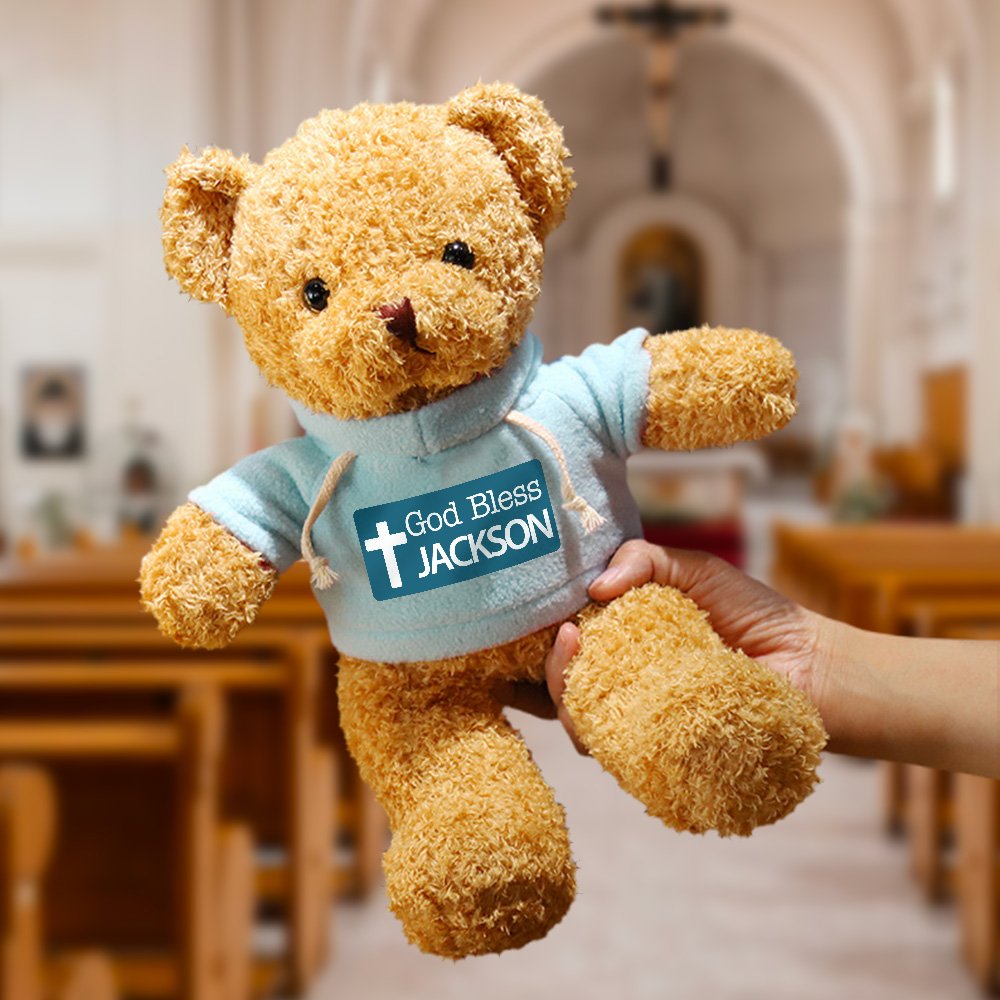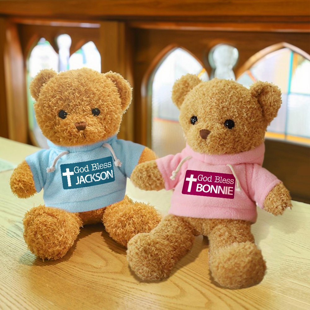 This adorable teddy bear wears a cozy pink or blue hoodie printed with the message "God Bless," spreading warmth and blessings. The cross pattern on its chest symbolizes spiritual strength and faith. Personalize it with your child's name for a truly unique touch.