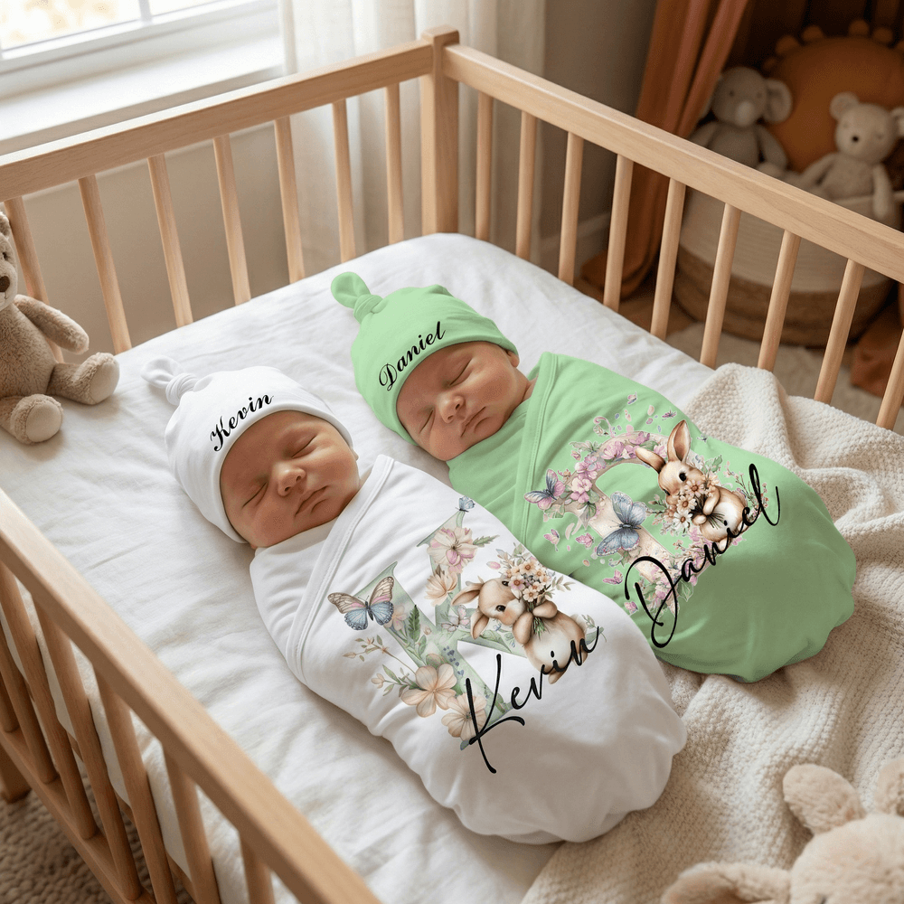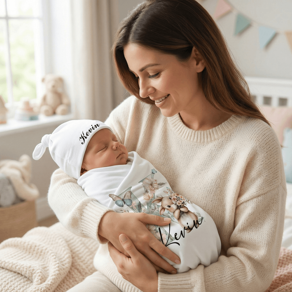 Personalized Cute Bouquet Bunny 100% Cotton Swaddle Blanket and Hat Set with Name Easter Birthday Baby Shower Gift for Newborns Babies