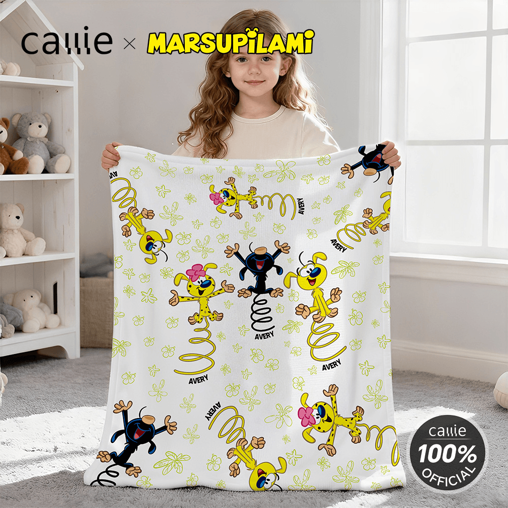 This delightful blanket features the adorable long-tailed cat, with its big eyes and expressive features. The cat radiates friendliness. The design allows for customizable names, making it a heartwarming gift for both cat enthusiasts and children. Vibrant hues bring this beloved character to life, adding a playful touch to any space.