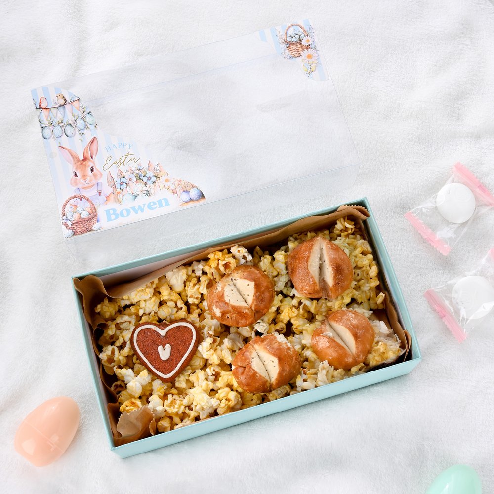 This Easter box features a Peter Rabbit theme, adorned with exquisite classic patterns on the exterior and a transparent lid that beautifully showcases the carefully arranged contents inside. The box supports personalization—you can have the recipient’s name or a heartfelt message printed on it, making it a unique keepsake for the holiday.