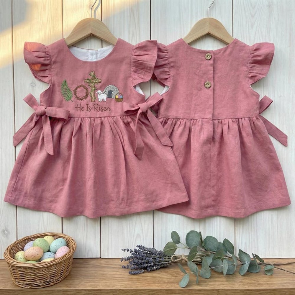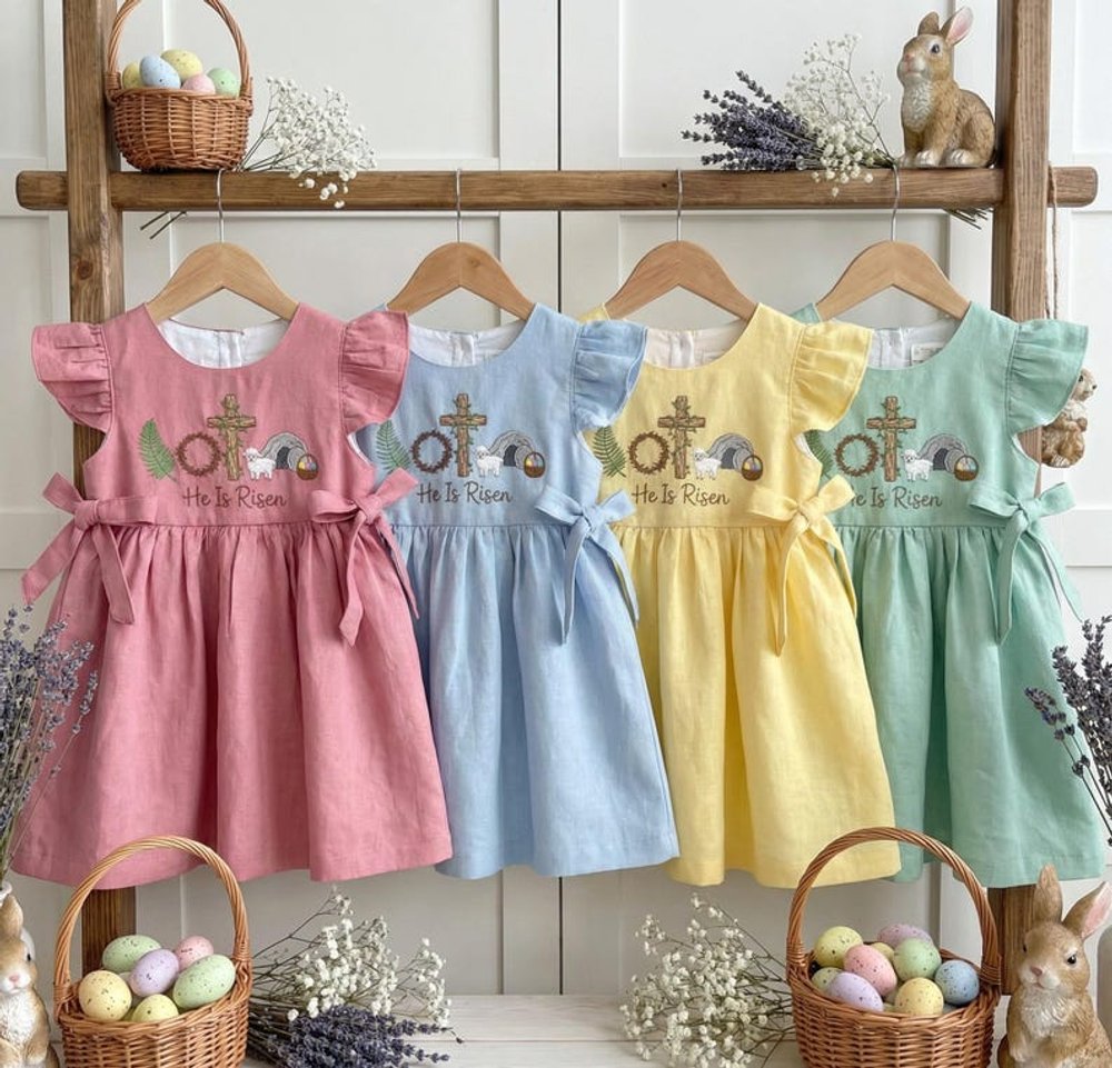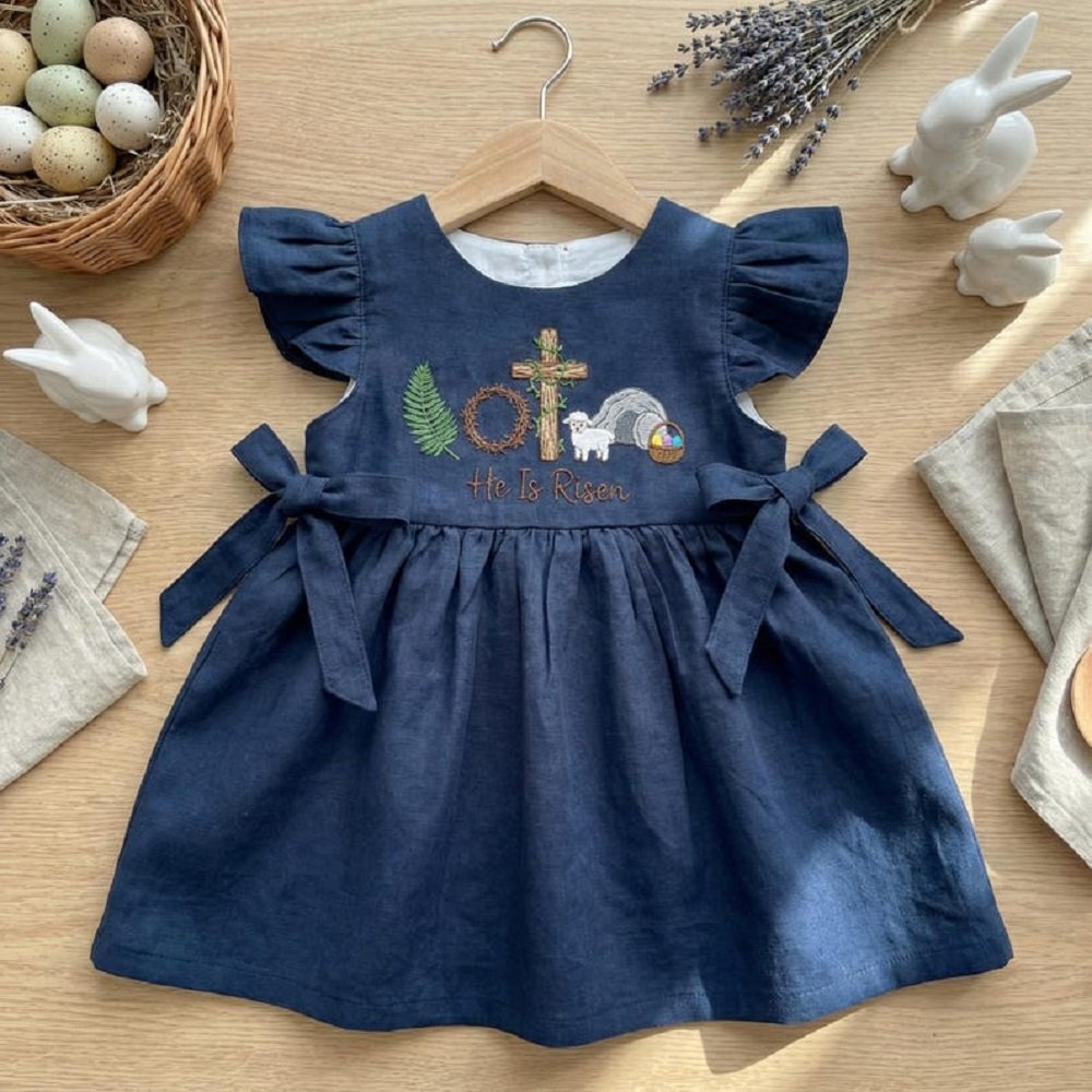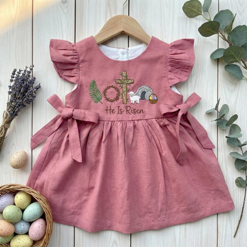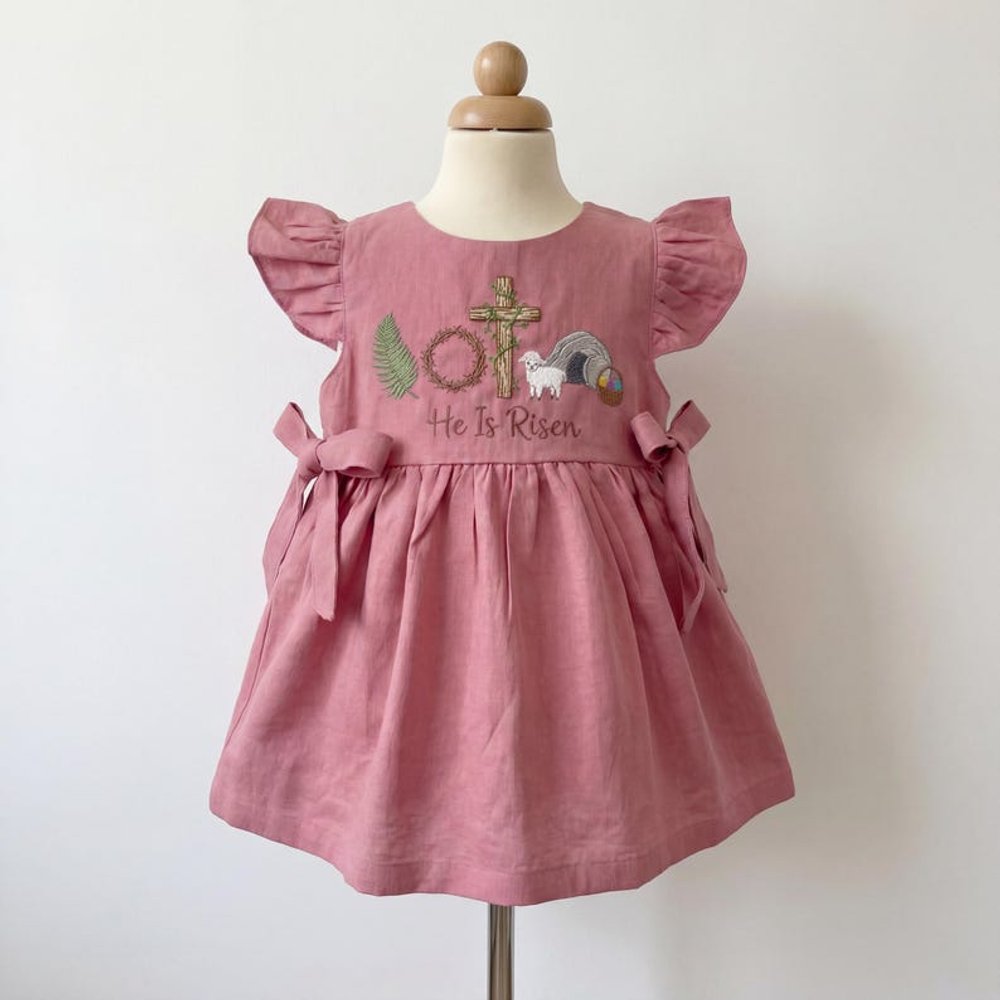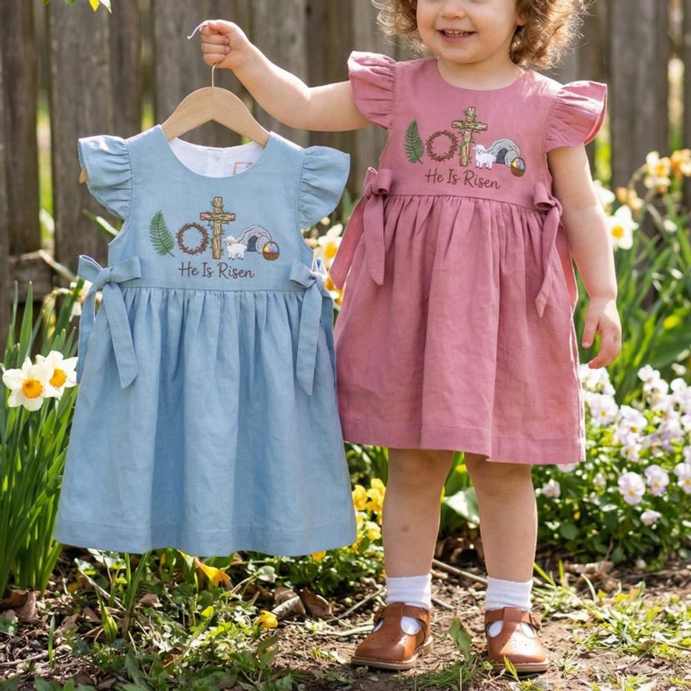 Add a personal touch by choosing this beautifully embroidered design that features a sheep, a cross, and the meaningful phrase “He Is Risen.” This customization transforms the dress into a cherished keepsake, perfect for celebrating the joy of Easter and your little girl’s faith.