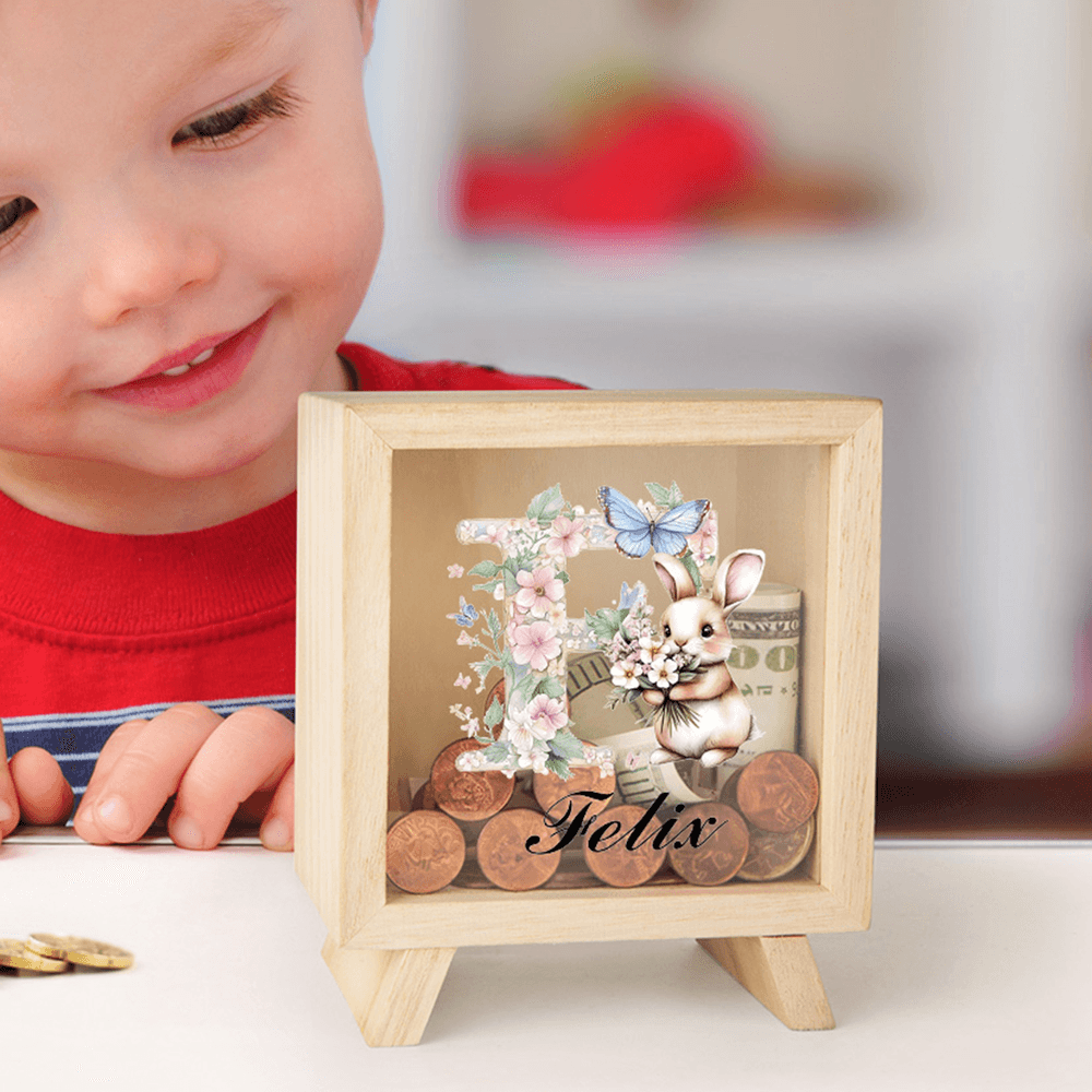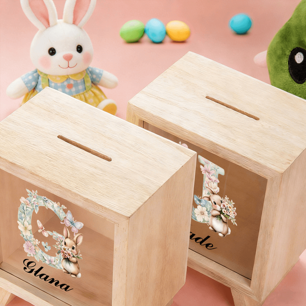 Personalized Floral Cartoon Bunny Wooden Clear Money Box Piggy Bank with Name and Initial Easter Gift for Boys and Girls