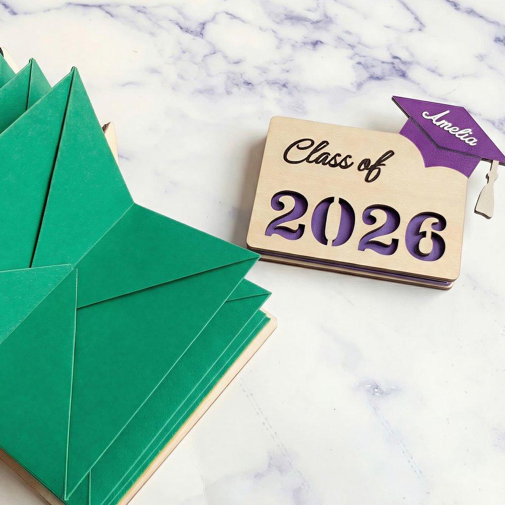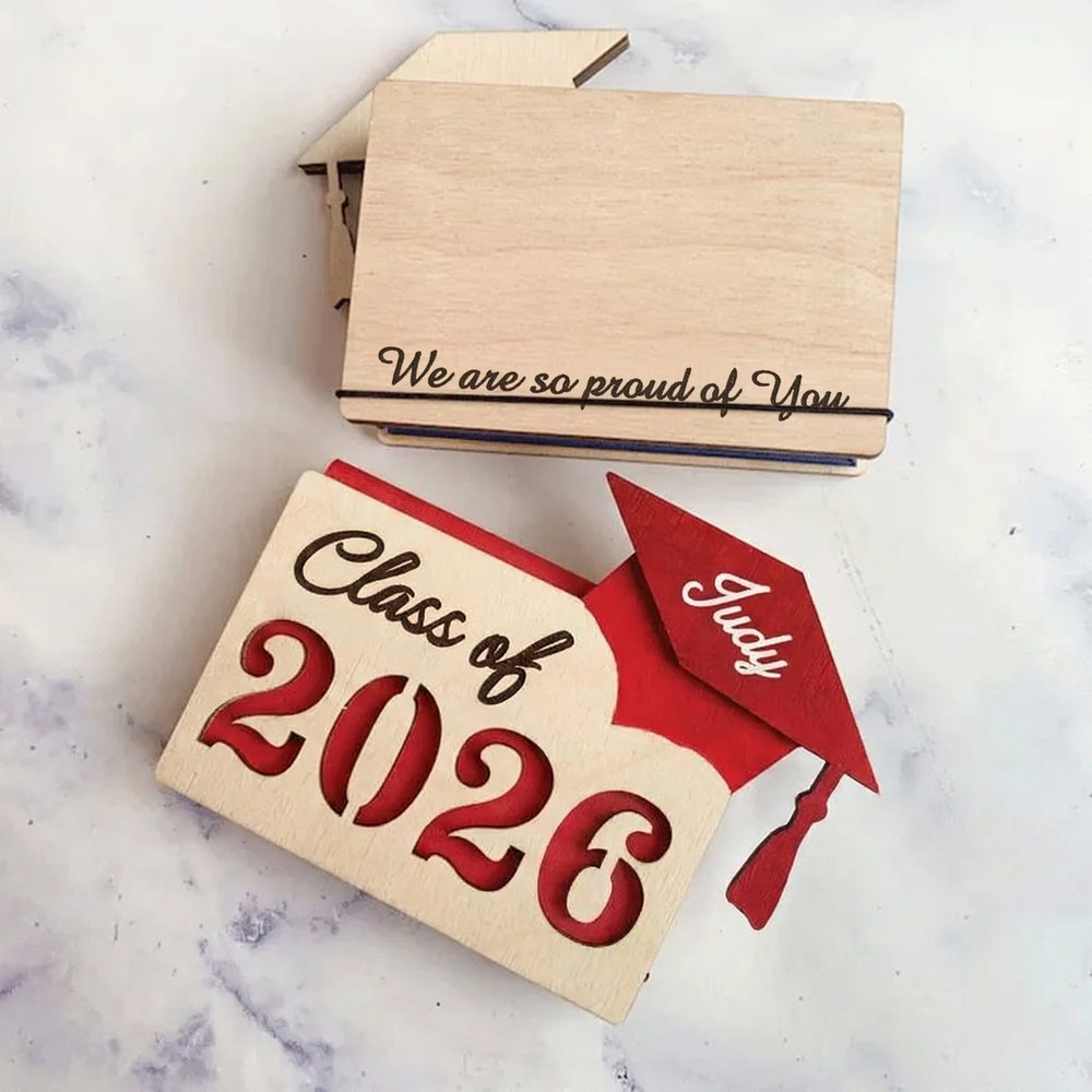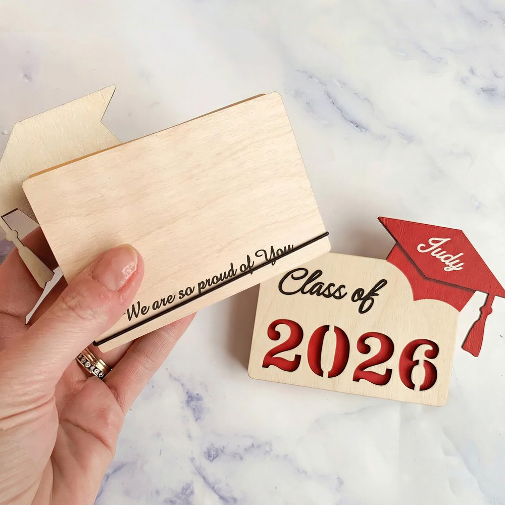 Crafted from high-quality laser-cut wood, this holder features a sleek design with graduation-themed motifs caps. A custom name and personal message are beautifully engraved, making each piece uniquely theirs. The interior includes a secure slot for gift cards, cash, or a handwritten note. Compact and elegant, it's the perfect size to accompany a card or present.