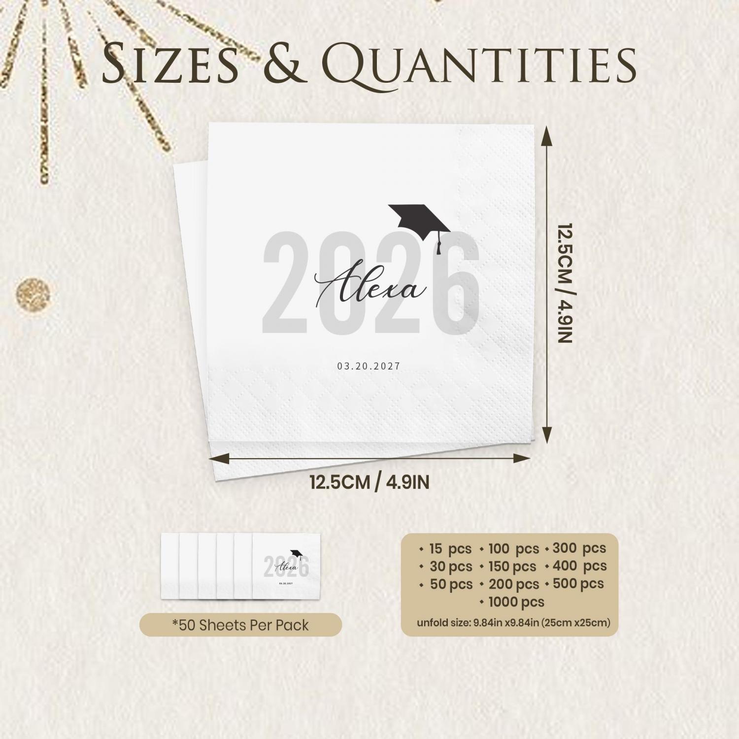 Crafted from high-quality, absorbent paper with a soft, embossed texture, these cocktail napkins are durable enough for everyday party use, resisting tearing and maintaining a crisp, clean look throughout your celebration. The fade-resistant, high-definition printing ensures the custom name, graduation year, and date stay vivid and legible, creating a polished, professional aesthetic that complements any graduation party theme.