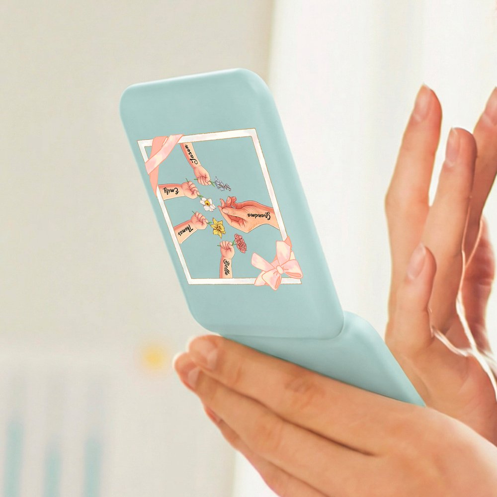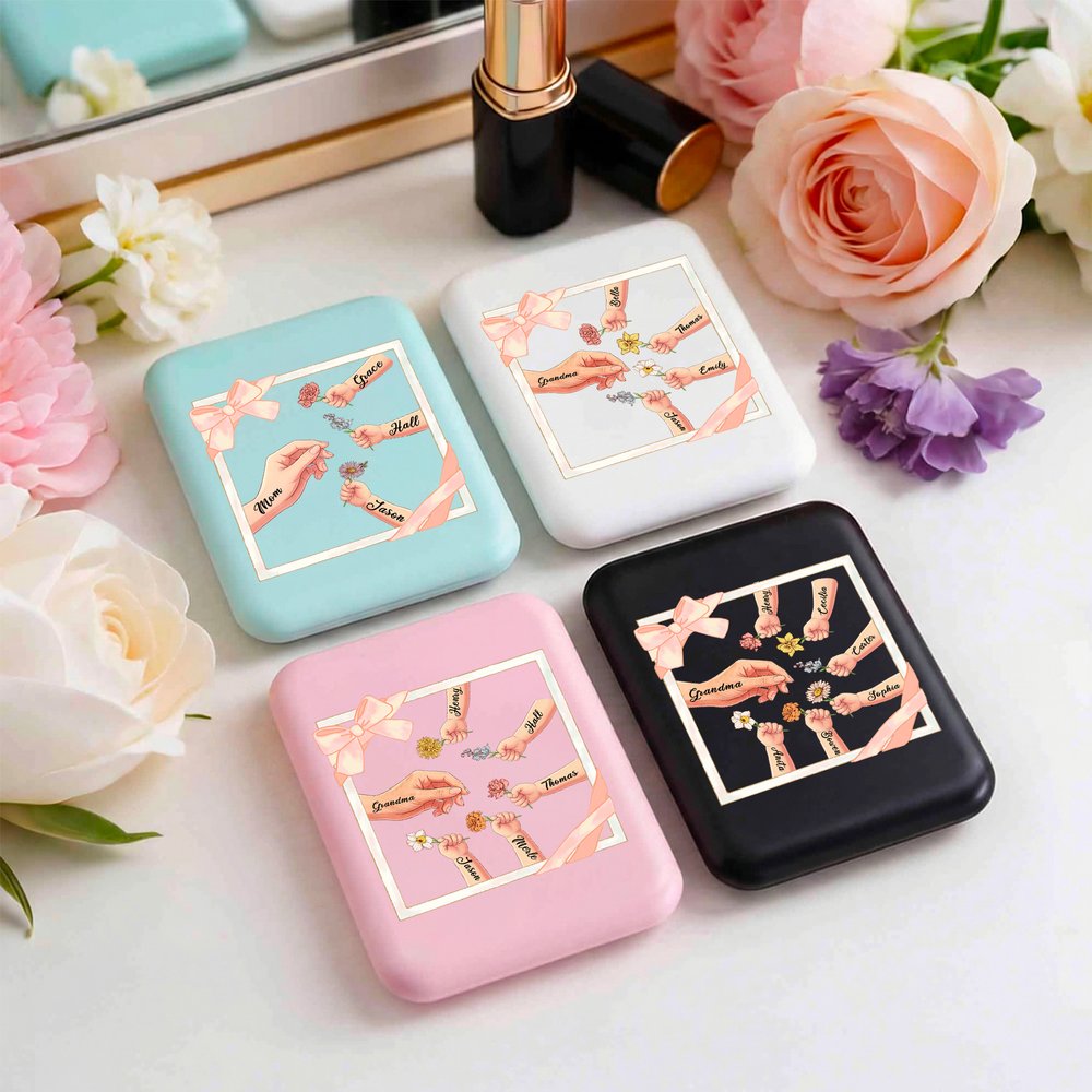 Reflect on the generations of love that shape a family with this Personalized Grandma Mom Kids Little Hands LED Compact Mirror. Featuring delicate hand illustrations representing grandma or mom, and little ones, along with custom names and birth flowers, this mirror is a daily reminder of the hands that nurture, guide, and hold close. With a built-in LED light for perfect touch-ups, it's both a practical beauty tool and a deeply sentimental keepsake.