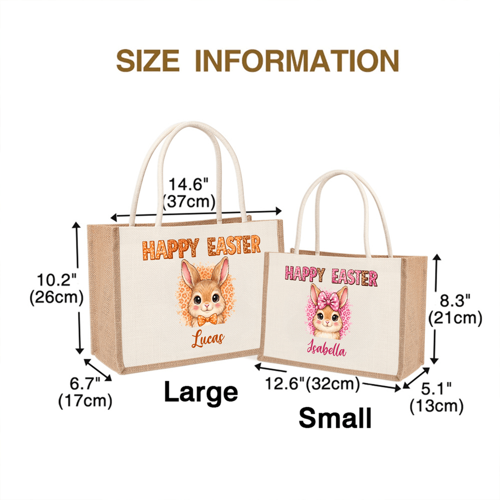 Personalized Happy Easter Leopard Cartoon Rabbit Large Capacity Jute Tote Bag with Name Egg Hunting Accessories Easter Gift for Kids