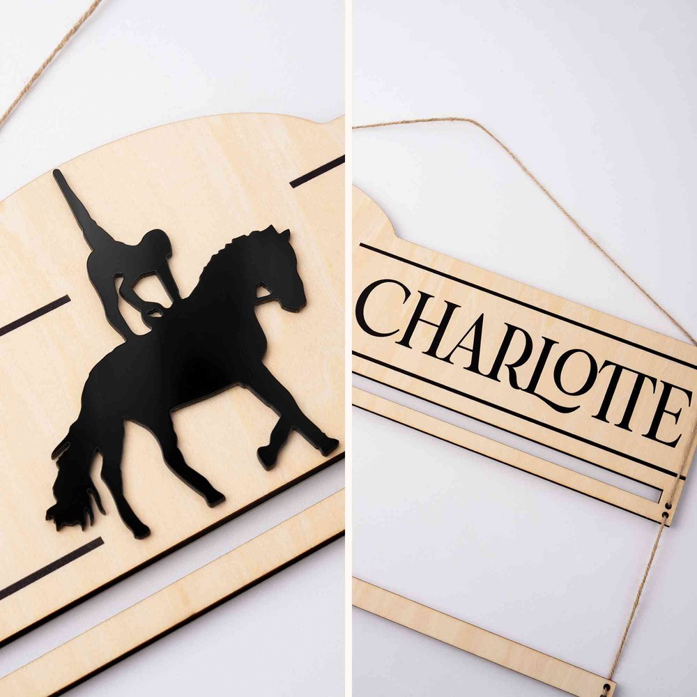Honor your riding achievements with this elegant ribbon display, featuring a beautiful horse-and-rider silhouette and customizable top bar for your name, your horse’s name, or a special message. Every ribbon tells a story – now display it with pride.