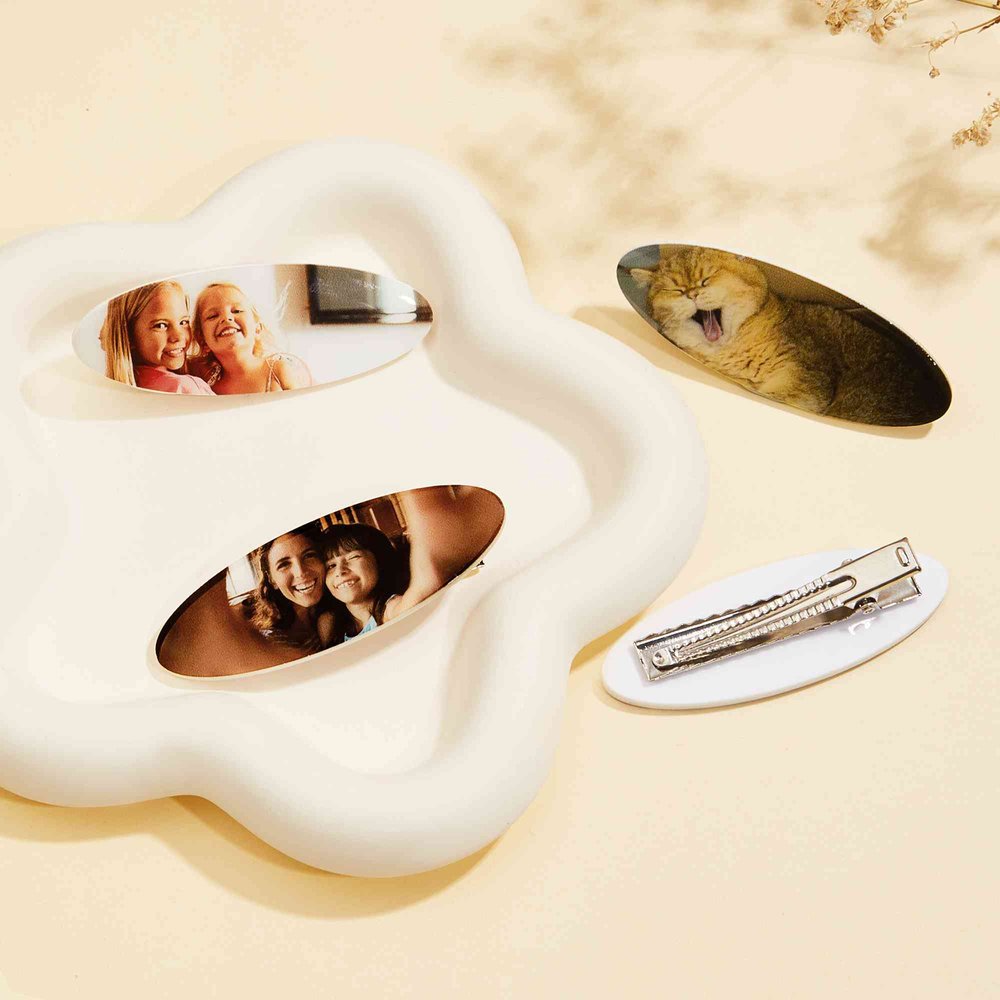 The unique feature of these hair clips is their personalized customization—each one is meticulously crafted, adorned with your photo or your beloved pet, showcasing their image with stunning detail and ensuring your one-of-a-kind companion becomes the center of attention. Whether you own a lively puppy or a playful cat, these hair clips allow you to fully express your pet's charm and bring a smile to everyone who sees them.