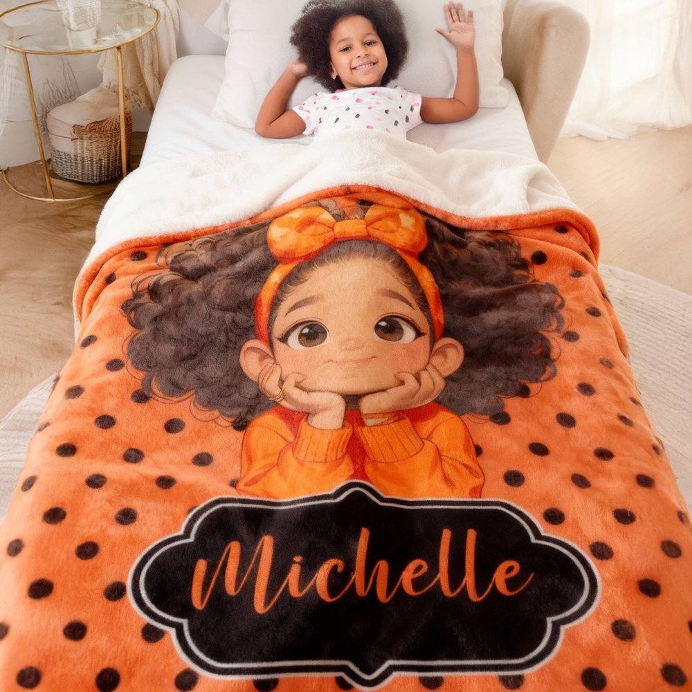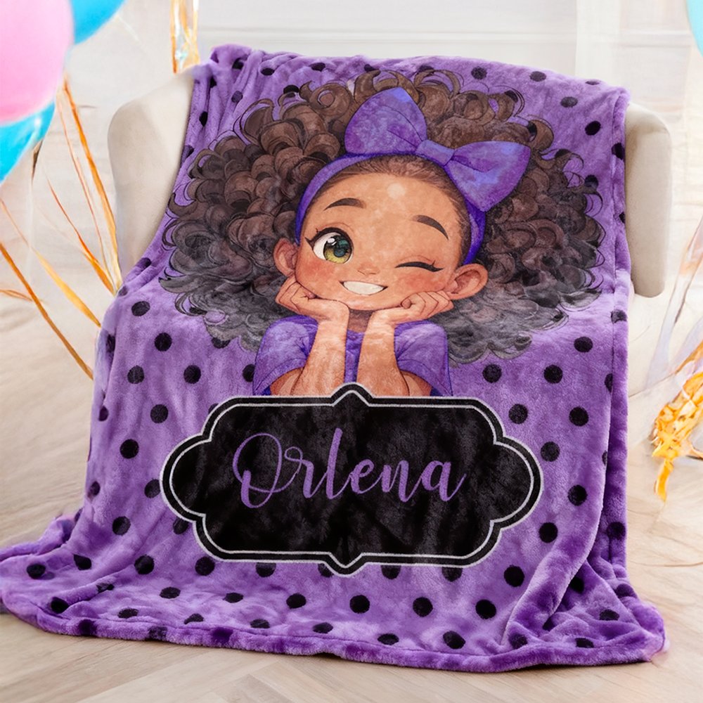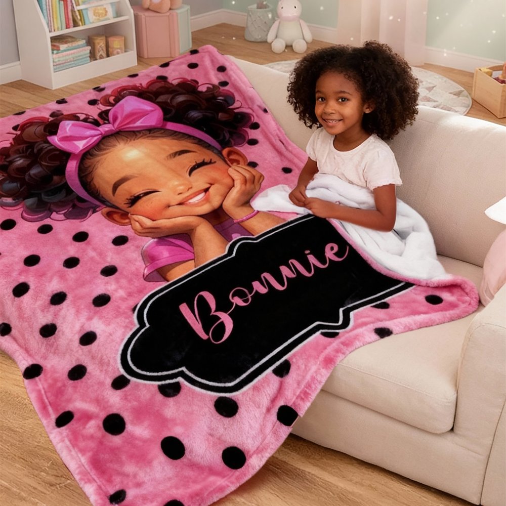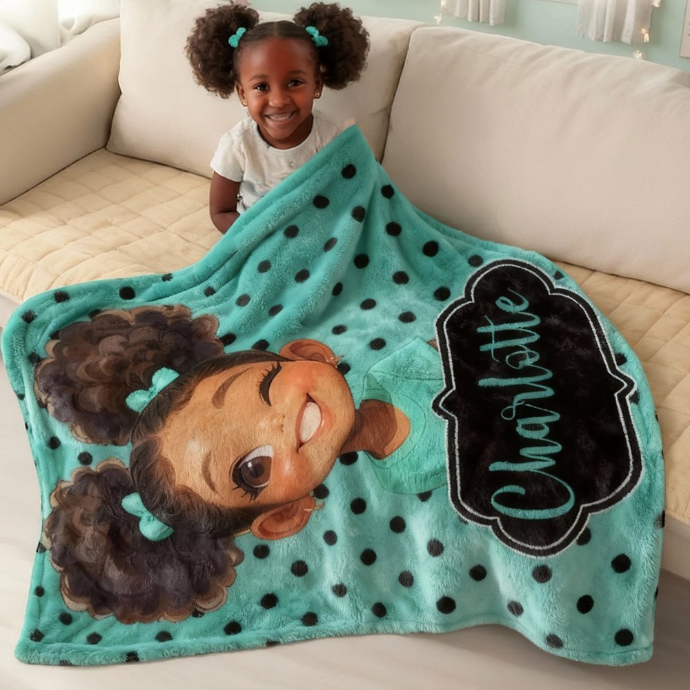 This blanket features a charming and playful design that combines a lovely Black cartoon girl with a classic polka-dot pattern. The cheerful contrast between the black dots and the soft blanket color creates a vibrant and eye-catching style. With 8 delightful designs to choose from and a custom name, each blanket becomes a one-of-a-kind treasure, offering African American girls a special accessory that reflects their identity with pride.