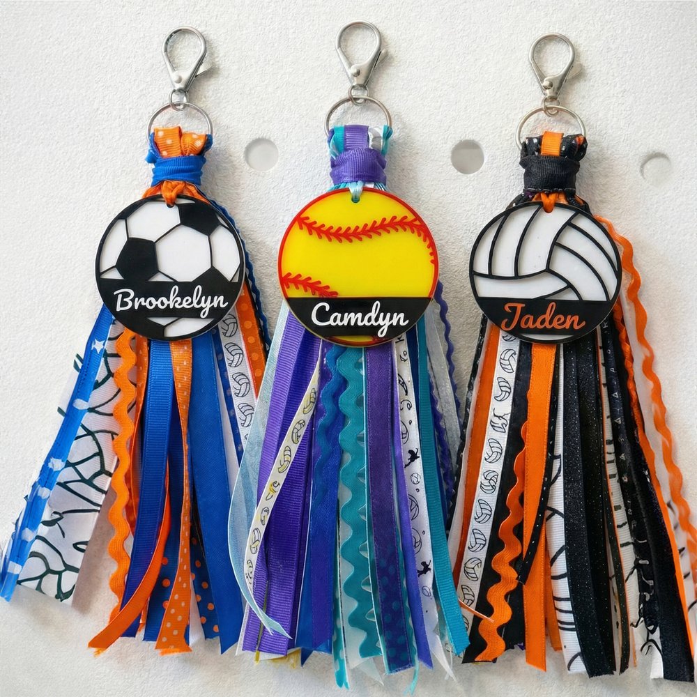 Crafted from 1/8-inch laser-cut acrylic in a multi-layer design, each tag can be customized with your name, number, or team motto. The attached tassel is handmade from a mix of 12 carefully selected ribbons, yarn, and cord for a full, lively swing. Measuring about 10 x 3 inches, it’s both eye-catching and durable—built to withstand the hustle of practice, travel, and game day.