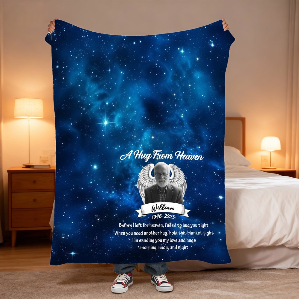 This custom memorial blanket features a serene night sky background adorned with angel wings and the heartfelt phrase “A Hug From Heaven,” creating a soothing and comforting ambiance. You can upload a photo of your loved one and personalize it with their name and significant dates, creating a unique keepsake that holds deep emotional meaning.