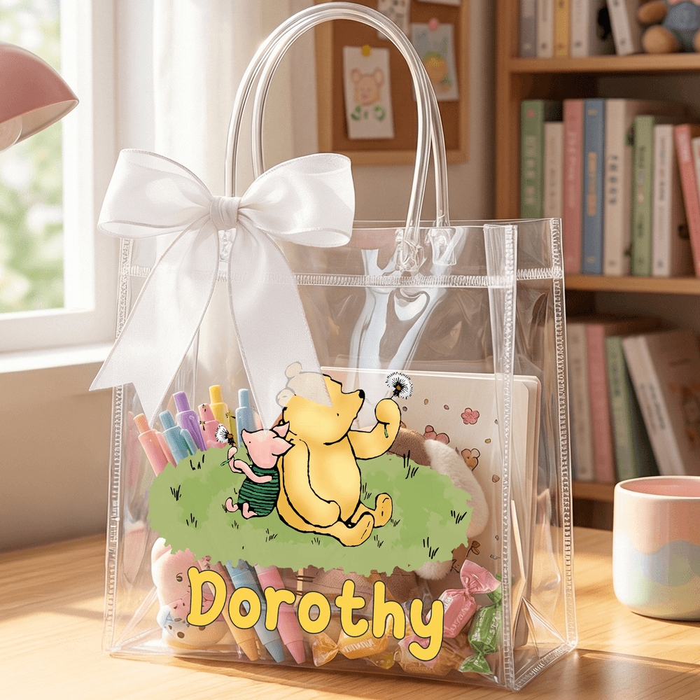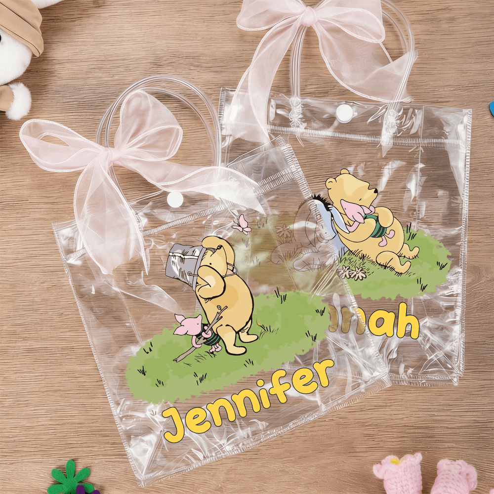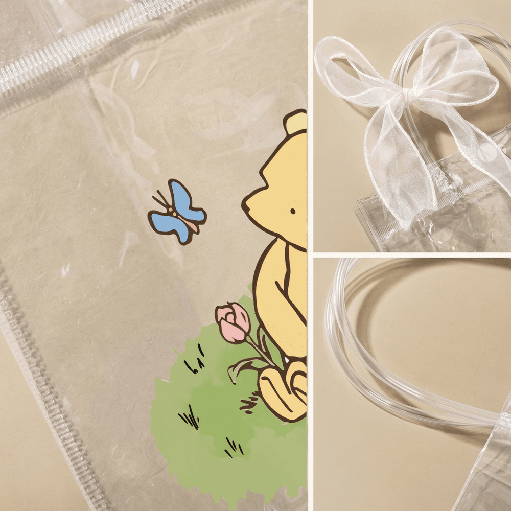 Featuring the classic Winnie the Pooh IP, this collection offers six adorable cartoon designs to choose from. Each bag can be personalized with your child's name, creating a truly one-of-a-kind gift. Crafted from transparent PVC and accented with an elegant hand-tied organza bow, the fresh, soothing color palette brings the playful charm of the Hundred Acre Wood to life. This features a charming classic Winnie the Pooh created by the renowned author A. A. Milne and has captured the hearts of generations.
