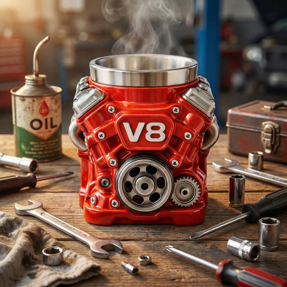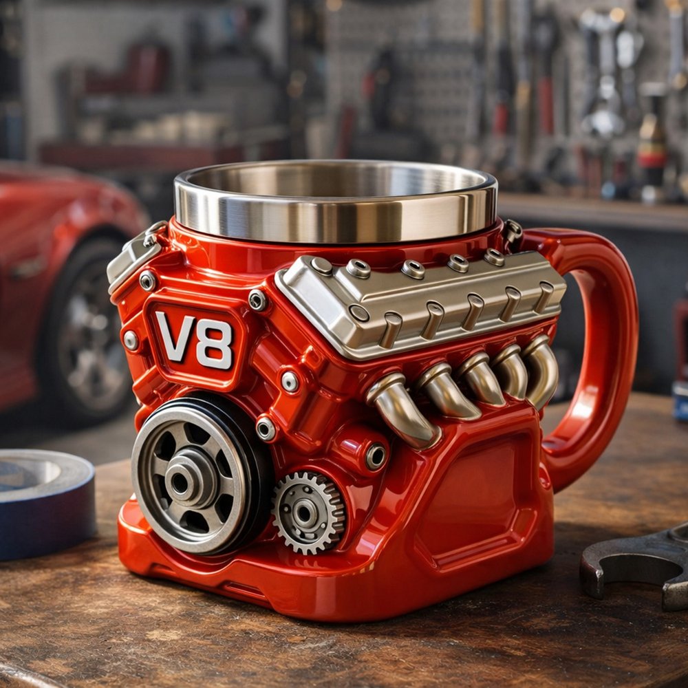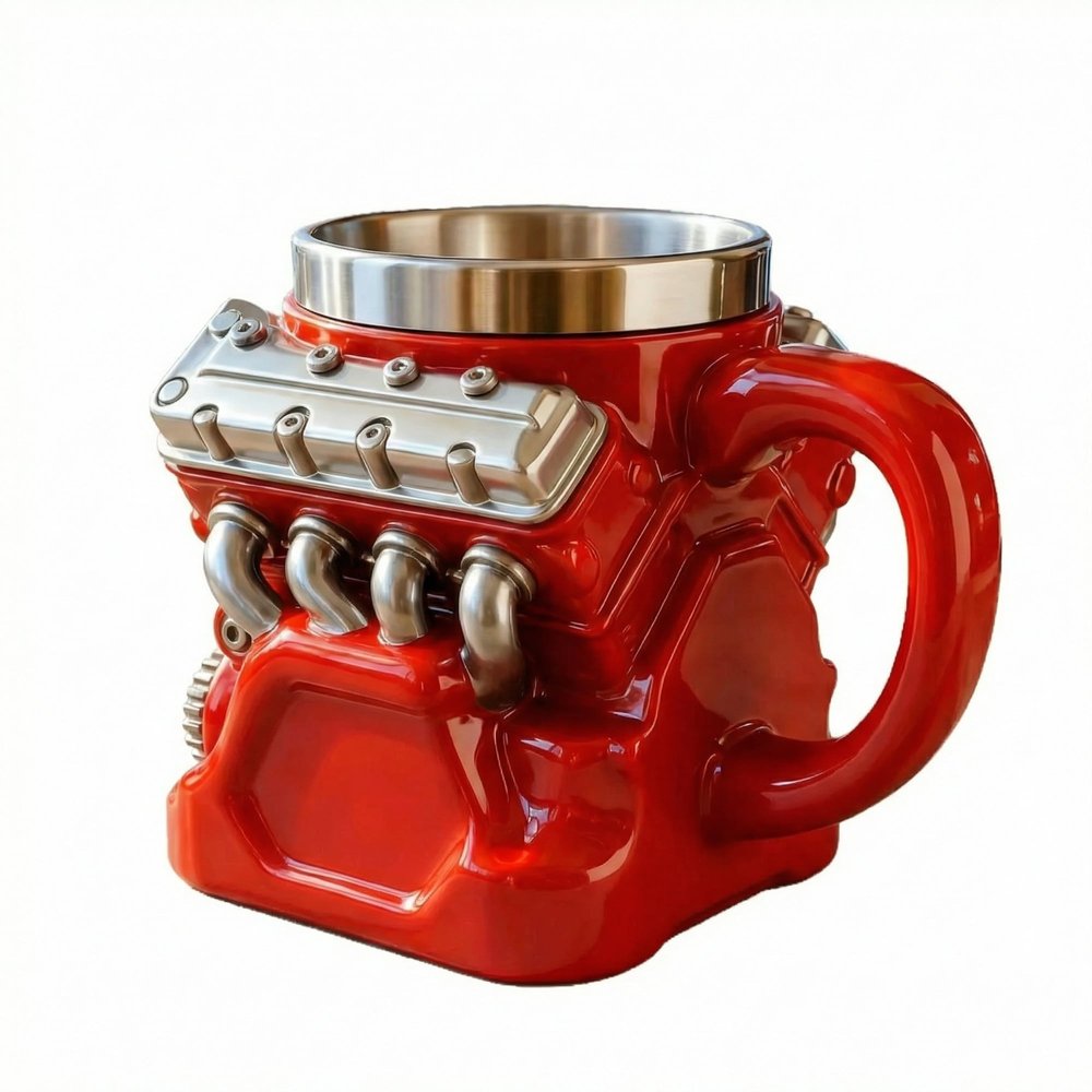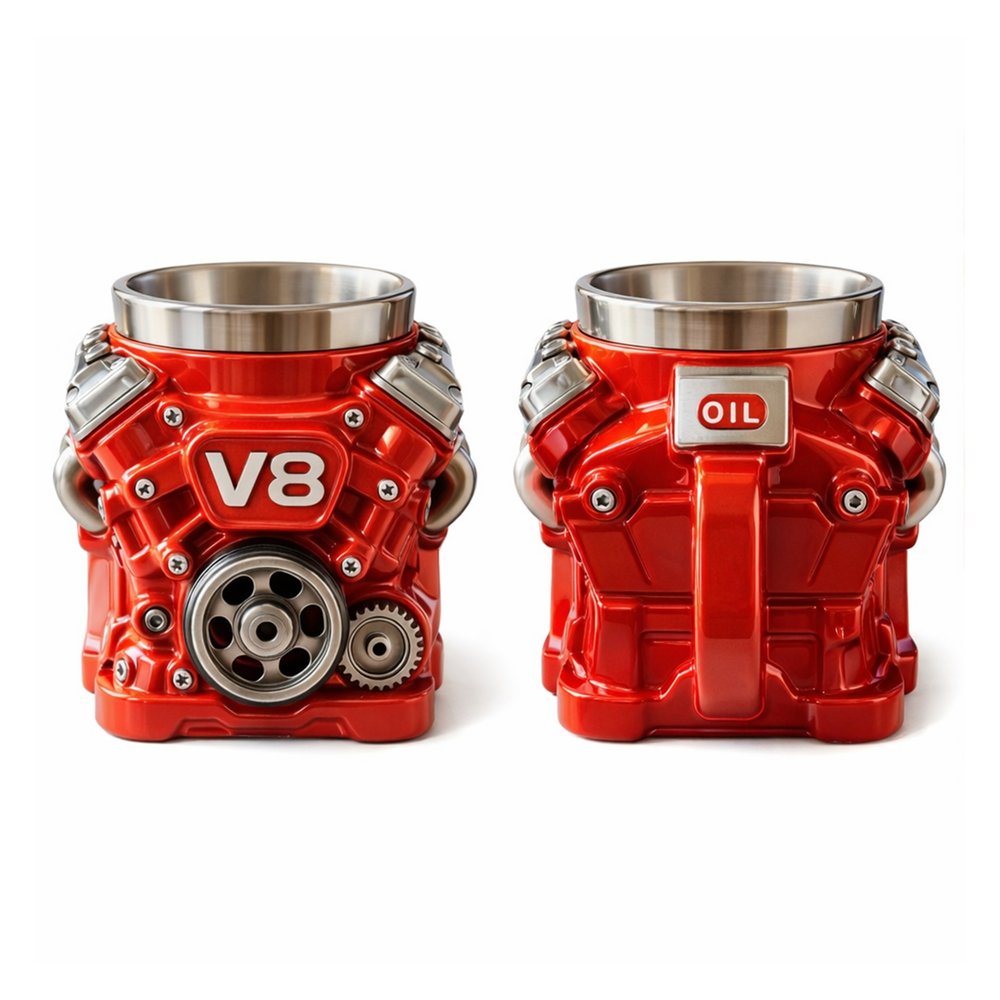 This unique mug combines a durable resin outer shell shaped into a detailed V8 engine block with an inner stainless steel cup thatâs insulated and easy to clean. Measuring 10.5 Ă 13 Ă 10.5 cm and weighing 360 g, itâs substantial in the hand yet comfortable to hold.