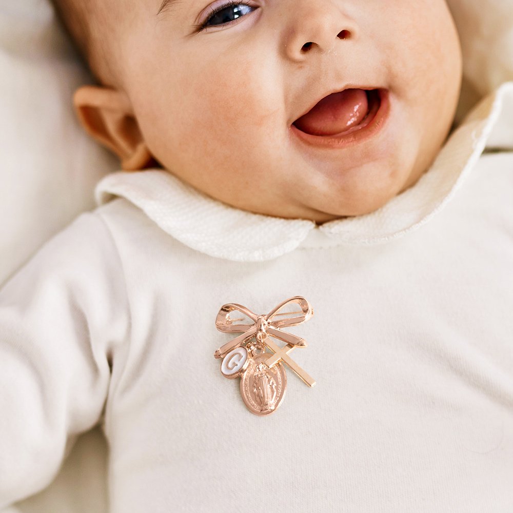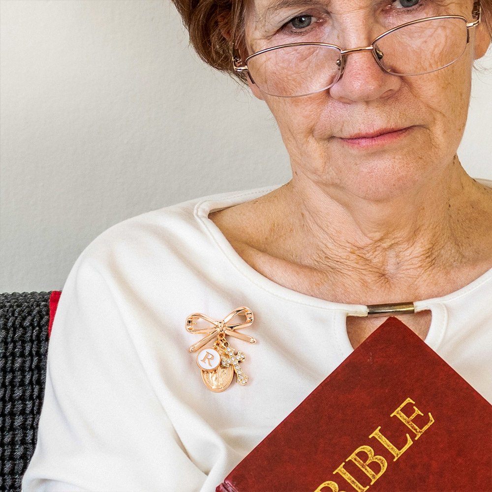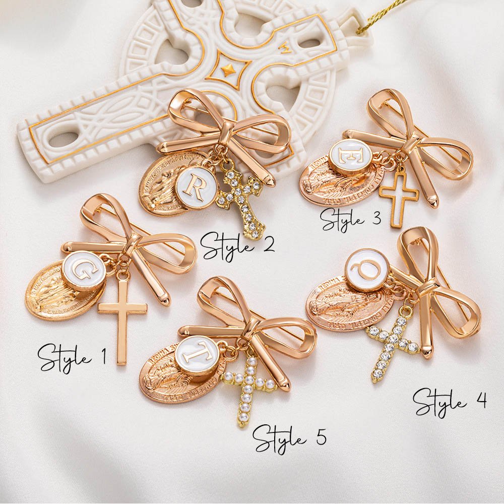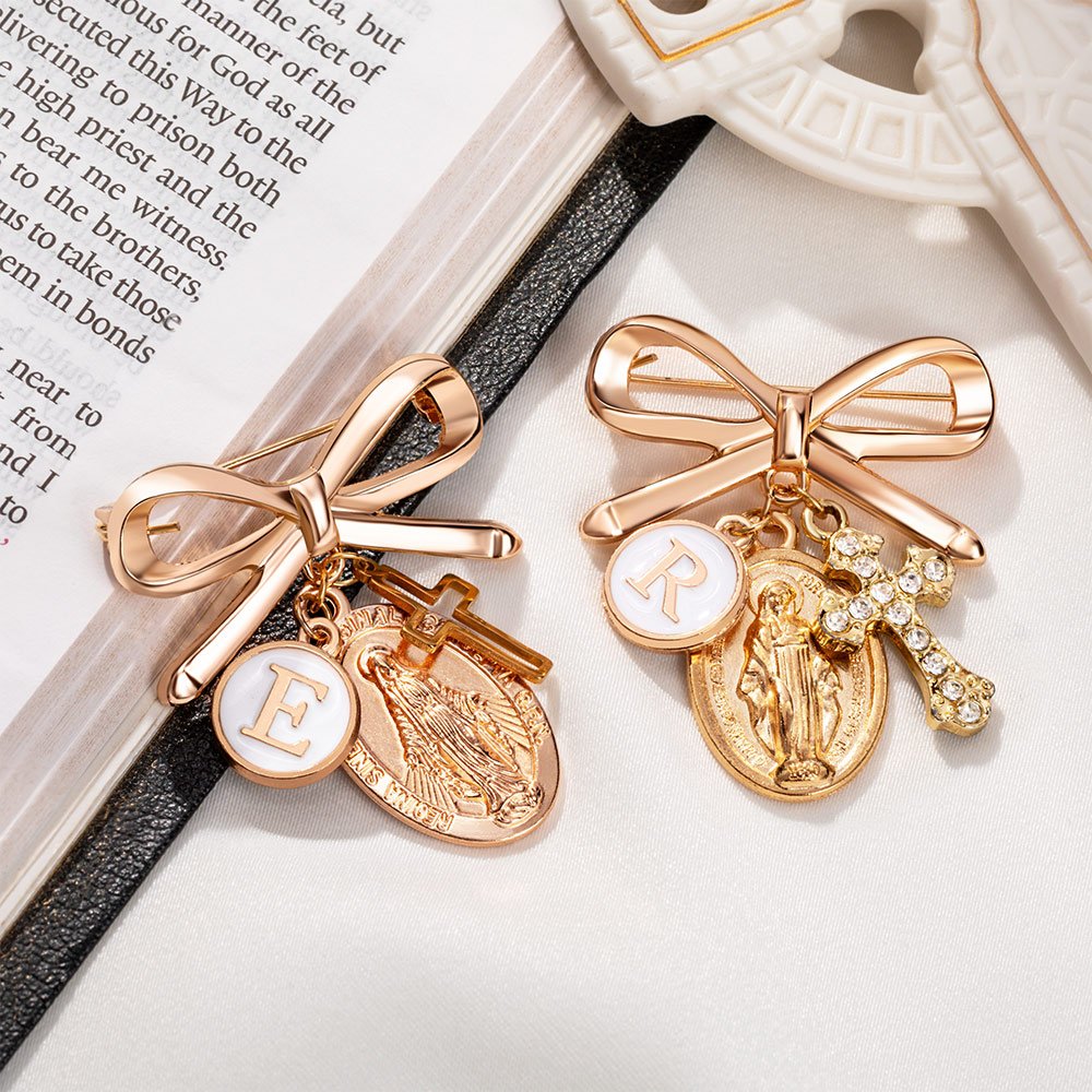 This brooch pin is inspired by the Virgin Mary, features a golden bow tie and a cross. It exudes both elegance and sophistication while expressing the wearer's unwavering faith and aspirations. Additionally, you can choose a customized initial based on your first name, making it a unique and one-of-a-kind accessory.