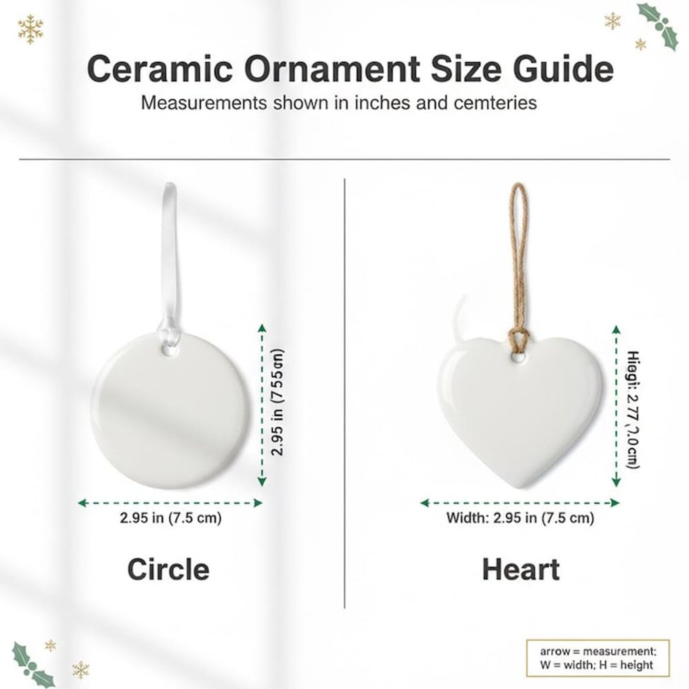 *Material: -High-quality white ceramic (3.4mm thick) β smooth, durable, and perfectly polished. -Clear glass β catches and reflects light for a stunning visual effect. -3mm-thick clear acrylic β durable, lightweight, and crystal-clear. *Shapes: Available in Circle and Heart β create a charming mix on your tree. *Print: Vibrant print on one side only. *Hanger Strings Included: Gold metallic string, red satin ribbon, and rustic jute twine.